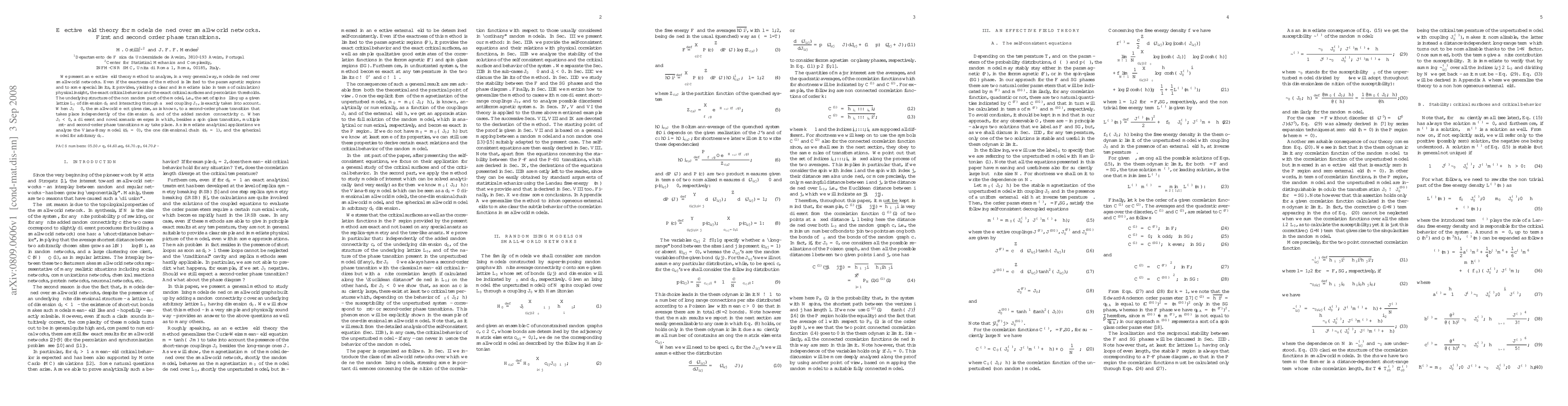 We present an effective field theory method to analyze, in a very general way, models defined over small-world networks. Even if the exactness of the method is limited to the paramagnetic regions and to some special limits, it provides, yielding a clear and immediate (also in terms of calculation) physical insight, the exact critical behavior and the exact critical surfaces and percolation thresholds. The underlying structure of the non random part of the model, i.e., the set of spins filling up a given lattice L_0 of dimension d_0 and interacting through a fixed coupling J_0, is exactly taken into account. When J_0\geq 0, the small-world effect gives rise, as is known, to a second-order phase transition that takes place independently of the dimension d_0 and of the added random connectivity c. When J_0<0, a different and novel scenario emerges in which, besides a spin glass transition, multiple first- and second-order phase transitions may take place. As immediate analytical applications we analyze the Viana-Bray model (d_0=0), the one dimensional chain (d_0=1), and the spherical model for arbitrary d_0.