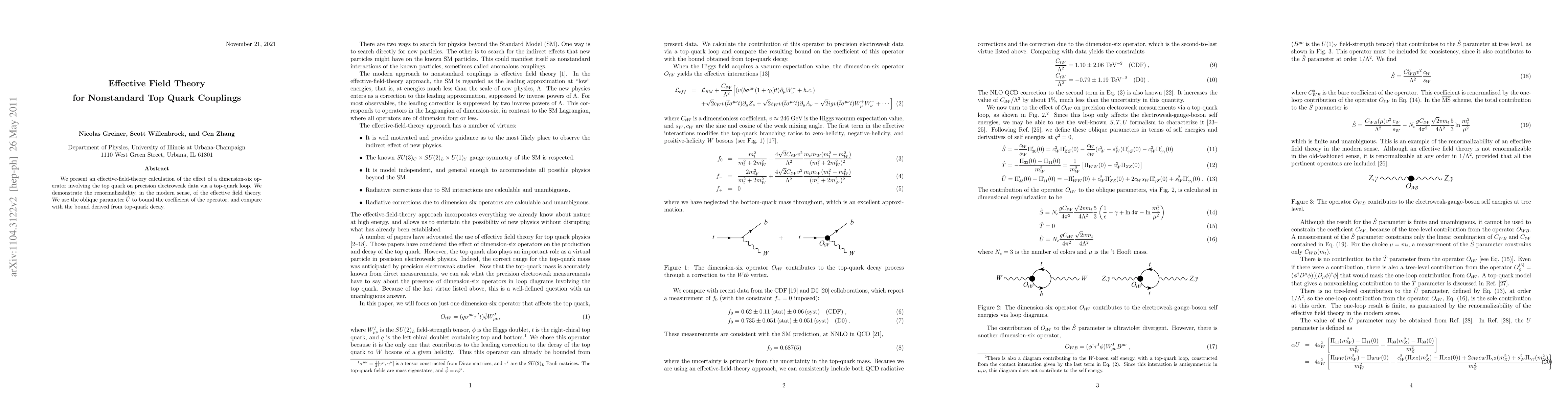 This paper develops an effective field theory to analyze the impact of a dimension-six top quark operator on precision electroweak data through top quark loops, demonstrating its renormalizability. It uses the oblique parameter U to constrain the operator's coefficient and compares these bounds with those from top quark decay.