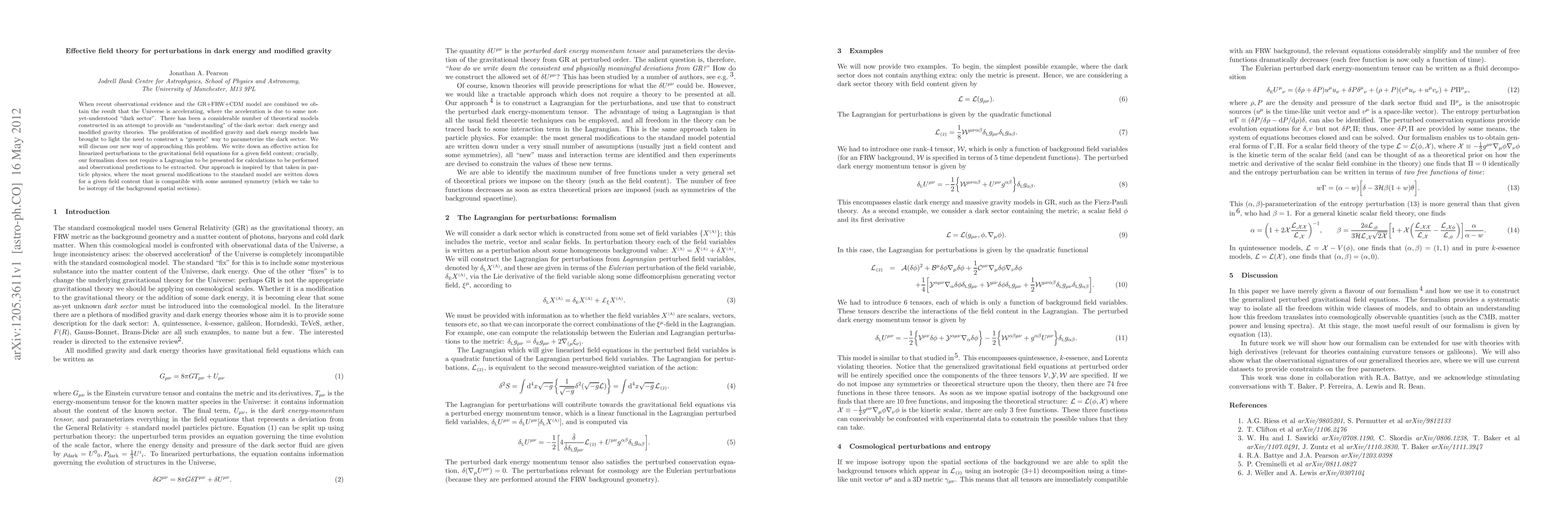 When recent observational evidence and the GR+FRW+CDM model are combined we obtain the result that the Universe is accelerating, where the acceleration is due to some not-yet-understood "dark sector". There has been a considerable number of theoretical models constructed in an attempt to provide an "understanding" of the dark sector: dark energy and modified gravity theories. The proliferation of modified gravity and dark energy models has brought to light the need to construct a "generic" way to parameterize the dark sector. We will discuss our new way of approaching this problem. We write down an effective action for linearized perturbations to the gravitational field equations for a given field content; crucially, our formalism does not require a Lagrangian to be presented for calculations to be performed and observational predictions to be extracted. Our approach is inspired by that taken in particle physics, where the most general modifications to the standard model are written down for a given field content that is compatible with some assumed symmetry (which we take to be isotropy of the background spatial sections).