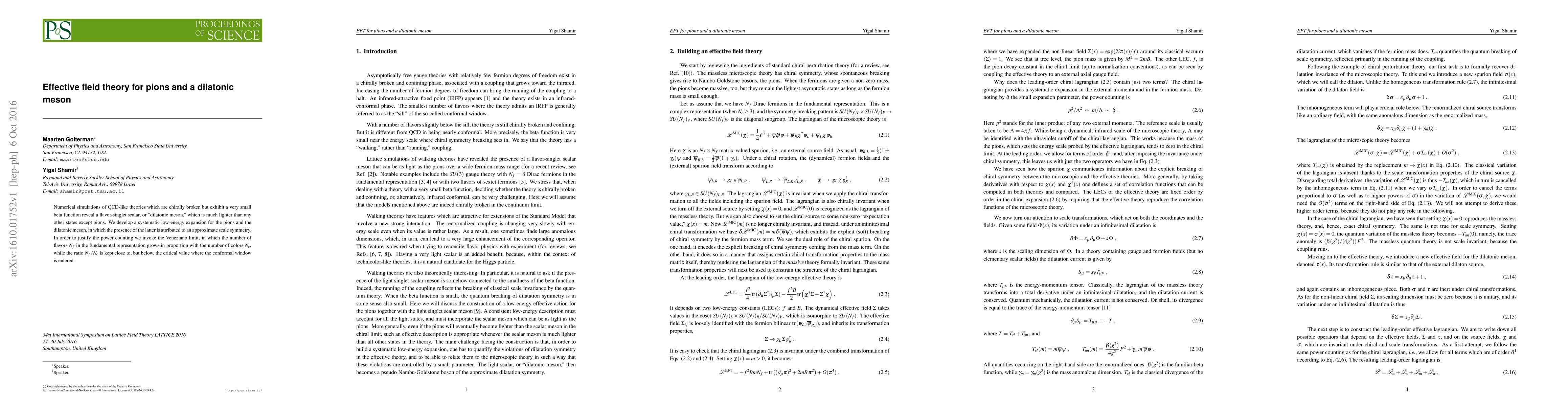 This paper develops an effective field theory for pions and a dilatonic meson in QCD-like theories with a small beta function, attributing the lightness of the dilatonic meson to an approximate scale symmetry. The study uses a systematic low-energy expansion and justifies the power counting through the Veneziano limit, where the number of flavors grows proportionally with the number of colors.