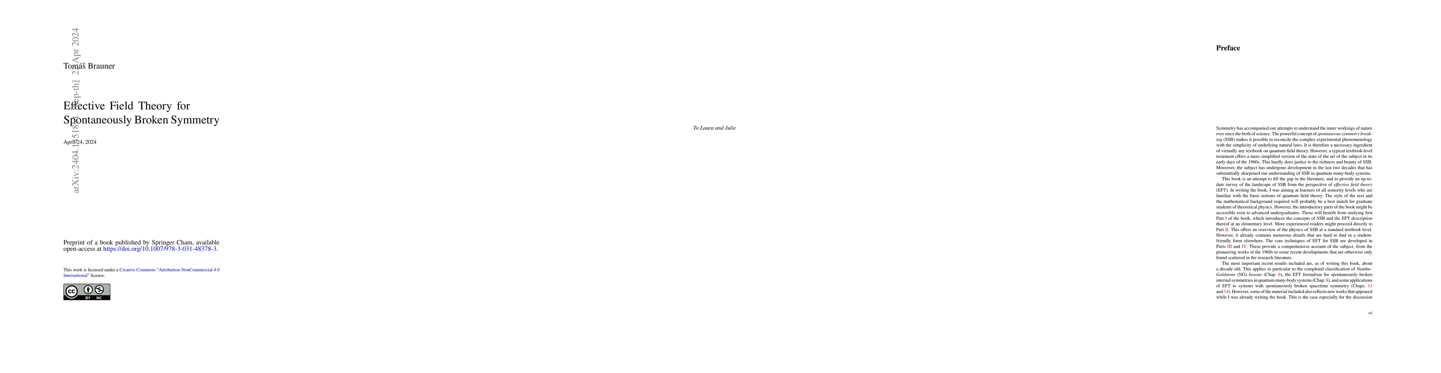 This is a preprint of an open-access book published by Springer Cham. The book gives an up-to-date overview of the physics of spontaneously broken continuous symmetry from the point of view of effective field theory. Upon building up the necessary foundations, the text reviews the classification of Nambu-Goldstone bosons and then focuses on the construction of the effective-field-theoretic description of their dynamics. Both internal and spacetime broken symmetries are covered, including numerous illustrative examples and a few selected applications, worked out in greater detail.