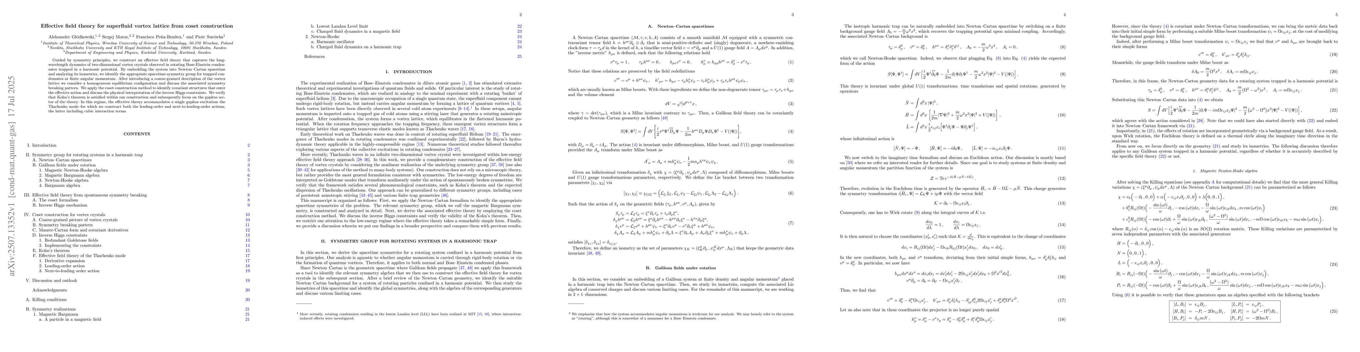 Guided by symmetry principles, we construct an effective field theory that captures the long-wavelength dynamics of two-dimensional vortex crystals observed in rotating Bose-Einstein condensates trapped in a harmonic potential. By embedding the system into Newton--Cartan spacetime and analyzing its isometries, we identify the appropriate spacetime symmetry group for trapped condensates at finite angular momentum. After introducing a coarse-grained description of the vortex lattice we consider a homogeneous equilibrium configuration and discuss the associated symmetry breaking pattern. We apply the coset construction method to identify covariant structures that enter the effective action and discuss the physical interpretation of the inverse Higgs constraints. We verify that Kohn's theorem is satisfied within our construction and subsequently focus on the gapless sector of the theory. In this regime, the effective theory accommodates a single gapless excitation--the Tkachenko mode--for which we construct both the leading-order and next-to-leading-order actions, the latter including cubic interaction terms.