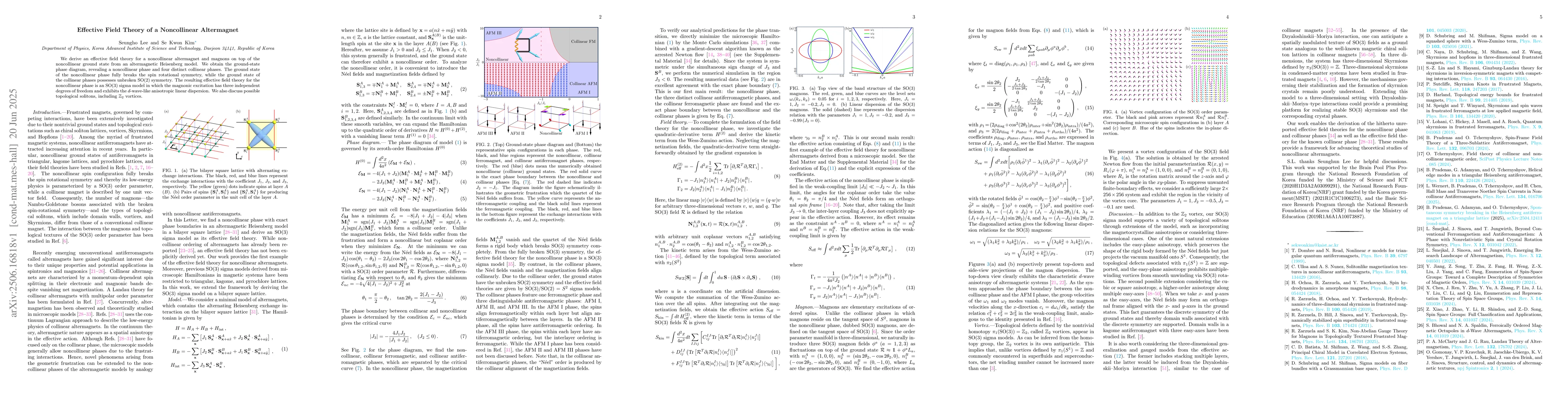 We derive an effective field theory for a noncollinear altermagnet and magnons on top of the noncollinear ground state from an altermagnetic Heisenberg model. We obtain the ground-state phase diagram, revealing a noncollinear phase and four distinct collinear phases. The ground state of the noncollinear phase fully breaks the spin rotational symmetry, while the ground state of the collinear phases possesses unbroken $\mathrm{SO}(2)$ symmetry. The resulting effective field theory for the noncollinear phase is an $\mathrm{SO}(3)$ sigma model in which the magnonic excitation has three independent degrees of freedom and exhibits the $d$-wave-like anisotropic linear dispersion. We also discuss possible topological solitons, including $\mathbb{Z}_2$ vortices.