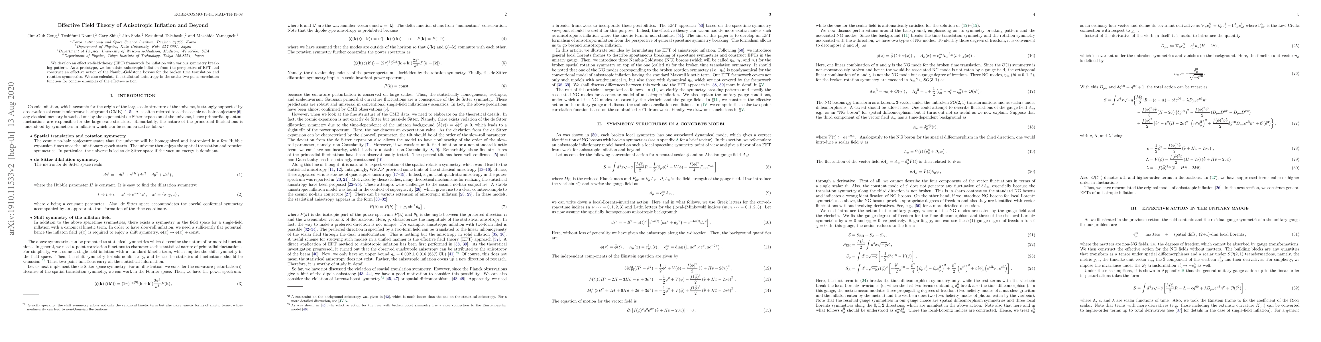 This paper develops an effective-field-theory framework for anisotropic inflation, constructing an effective action for Nambu-Goldstone bosons associated with broken time translation and rotation symmetries, and calculates the resulting statistical anisotropy in the scalar two-point correlation function.
