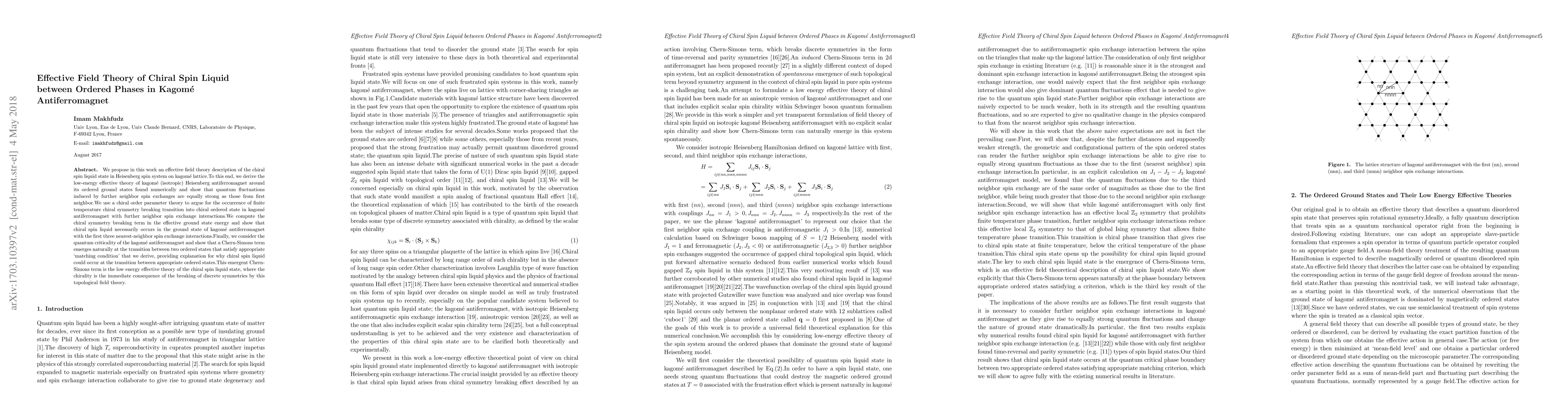 We propose in this work an effective field theory description of the chiral spin liquid state in Heisenberg spin system on kagom\'e lattice.To this end, we derive the low-energy effective theory of kagom\'e (isotropic) Heisenberg antiferromagnet around its ordered ground states found numerically and show that quantum fluctuations induced by further neighbor spin exchanges are equally strong as those from first neighbor.We use a chiral order parameter theory to argue for the occurrence of finite temperature chiral symmetry breaking transition into chiral ordered state in kagom\'e antiferromagnet with further neighbor spin exchange interactions.We compute the chiral symmetry breaking term in the effective ground state energy and show that chiral spin liquid necessarily occurs in the ground state of kagom\'e antiferromagnet with the first three nearest-neighbor spin exchange interactions.Finally, we consider the quantum criticality of the kagom\'e antiferromagnet and show that a Chern-Simons term emerges naturally at the transition between two ordered states that satisfy appropriate `matching condition' that we derive, providing explanation for why chiral spin liquid could occur at the transition between appropriate ordered states.This emergent Chern-Simons term is the low energy effective theory of the chiral spin liquid state, where the chirality is the immediate consequence of the breaking of discrete symmetries by this topological field theory.