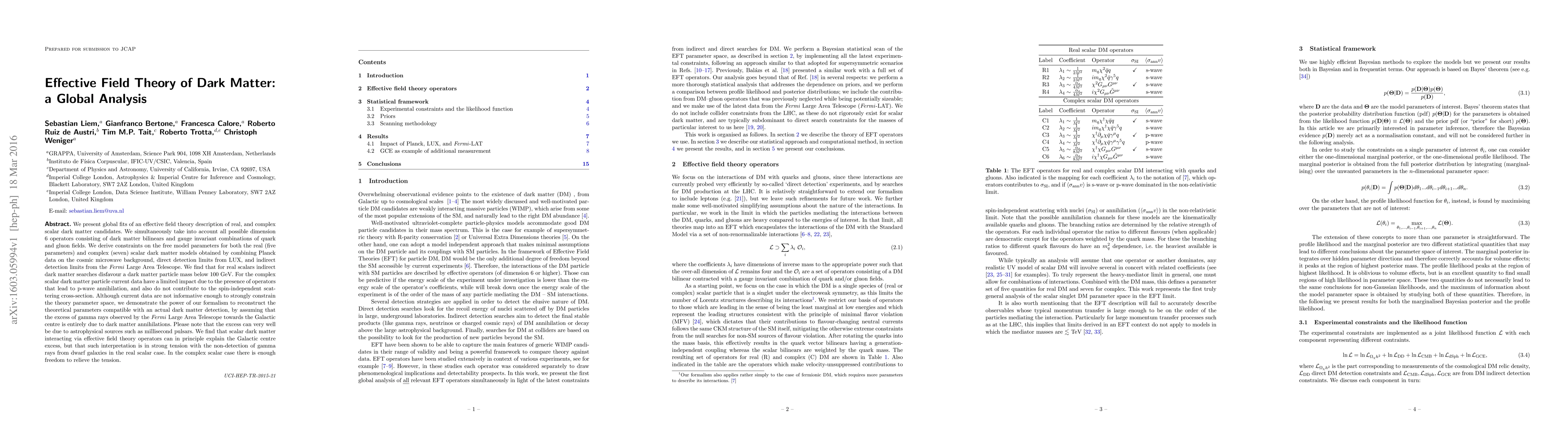We present global fits of an effective field theory description of real, and complex scalar dark matter candidates. We simultaneously take into account all possible dimension 6 operators consisting of dark matter bilinears and gauge invariant combinations of quark and gluon fields. We derive constraints on the free model parameters for both the real (five parameters) and complex (seven) scalar dark matter models obtained by combining Planck data on the cosmic microwave background, direct detection limits from LUX, and indirect detection limits from the Fermi Large Area Telescope. We find that for real scalars indirect dark matter searches disfavour a dark matter particle mass below 100 GeV. For the complex scalar dark matter particle current data have a limited impact due to the presence of operators that lead to p-wave annihilation, and also do not contribute to the spin-independent scattering cross- section. Although current data are not informative enough to strongly constrain the theory parameter space, we demonstrate the power of our formalism to reconstruct the theoretical parameters compatible with an actual dark matter detection, by assuming that the excess of gamma rays observed by the Fermi Large Area Telescope towards the Galactic centre is entirely due to dark matter annihilations. Please note that the excess can very well be due to astrophysical sources such as millisecond pulsars. We find that scalar dark matter interacting via effective field theory operators can in principle explain the Galactic centre excess, but that such interpretation is in strong tension with the non-detection of gamma rays from dwarf galaxies in the real scalar case. In the complex scalar case there is enough freedom to relieve the tension.