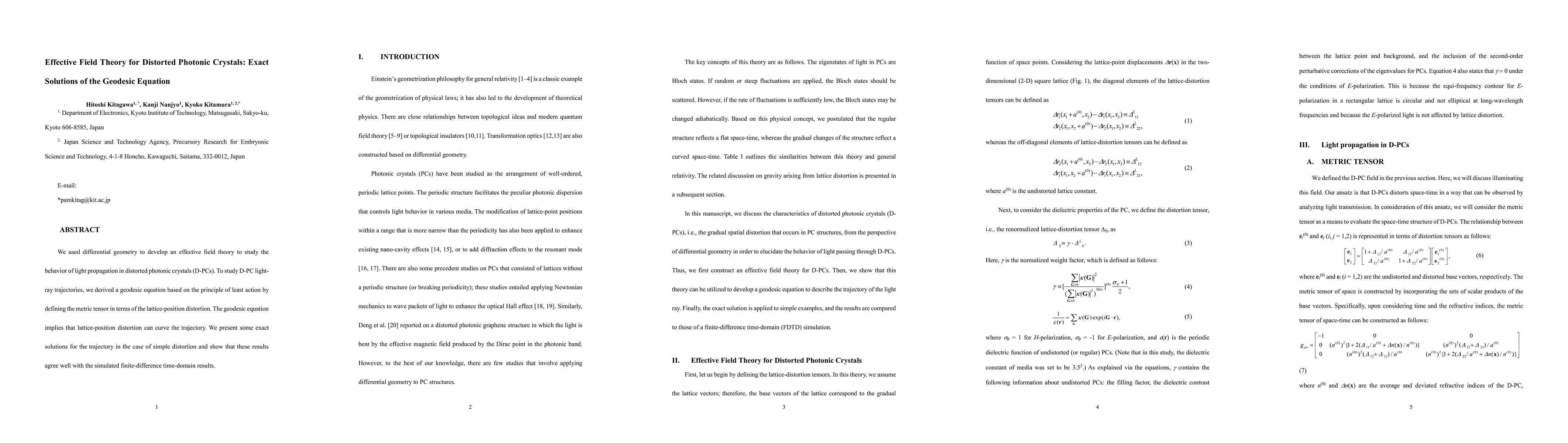 This research derives geodesics equations for light propagation in distorted-photonic crystals (D-PCs) using an effective field theory approach, revealing that lattice-position distortions can bend light trajectories. Exact solutions for simple distortions align with Finite Difference Time Domain (FDTD) simulations.