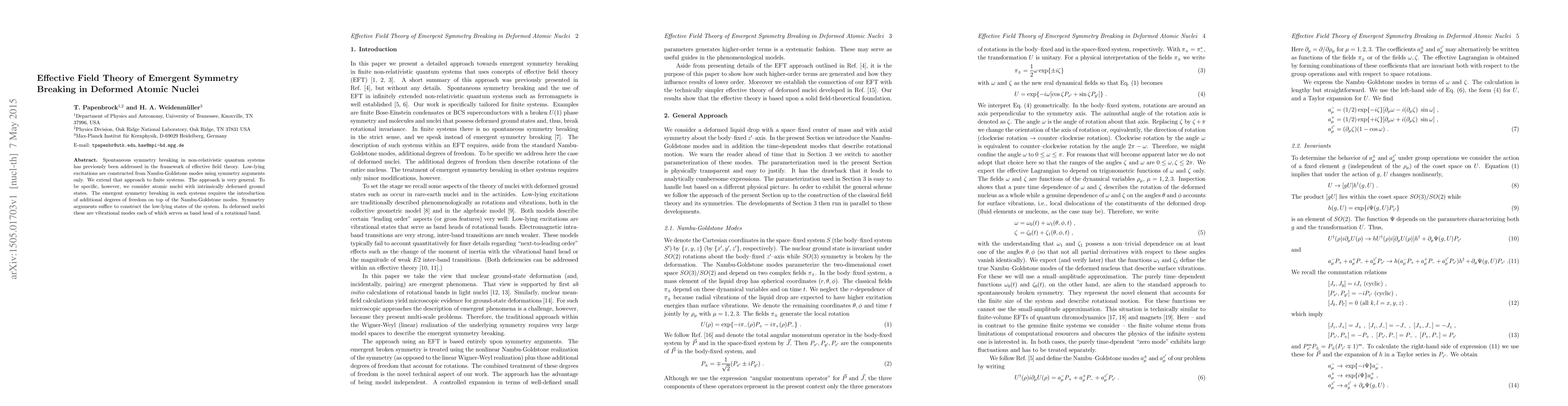 Spontaneous symmetry breaking in non-relativistic quantum systems has previously been addressed in the framework of effective field theory. Low-lying excitations are constructed from Nambu-Goldstone modes using symmetry arguments only. We extend that approach to finite systems. The approach is very general. To be specific, however, we consider atomic nuclei with intrinsically deformed ground states. The emergent symmetry breaking in such systems requires the introduction of additional degrees of freedom on top of the Nambu-Goldstone modes. Symmetry arguments suffice to construct the low-lying states of the system. In deformed nuclei these are vibrational modes each of which serves as band head of a rotational band.