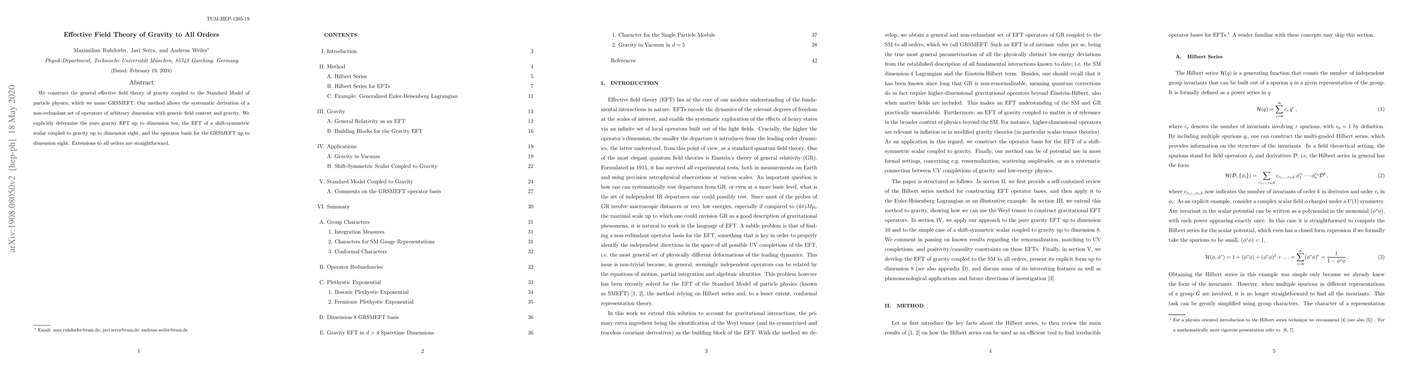 This paper constructs the GRSMEFT, a comprehensive effective field theory of gravity coupled to the Standard Model, allowing systematic derivation of operators of arbitrary dimension. It determines the pure gravity EFT up to dimension ten, the EFT of a shift-symmetric scalar up to dimension eight, and provides the operator basis for GRSMEFT up to dimension eight, with straightforward extensions to all orders.