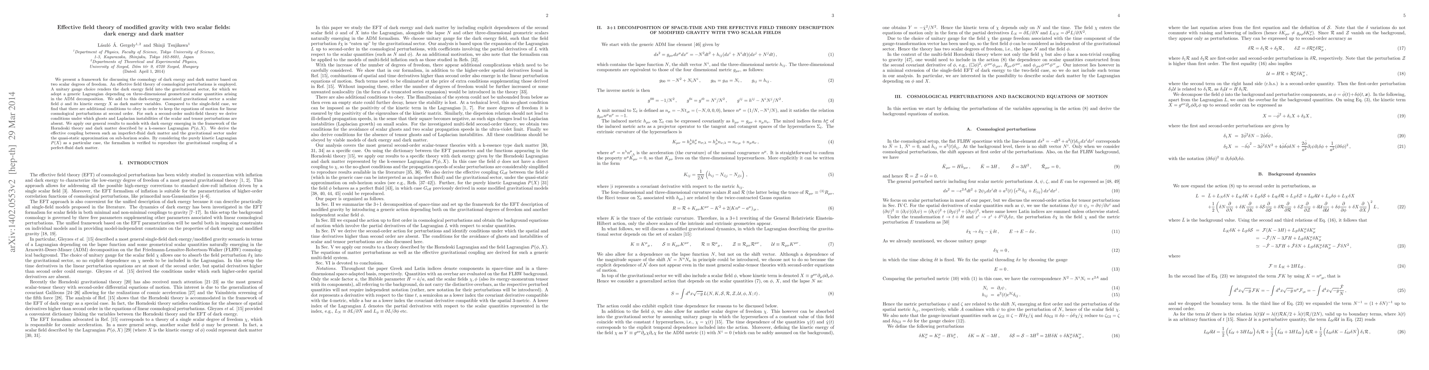This paper develops an effective field theory for modified gravity with two scalar fields, representing dark energy and dark matter, ensuring stability and second-order equations of motion. It applies the framework to Horndeski dark energy and k-essence dark matter models, deriving effective couplings and verifying the formalism against perfect-fluid dark matter.