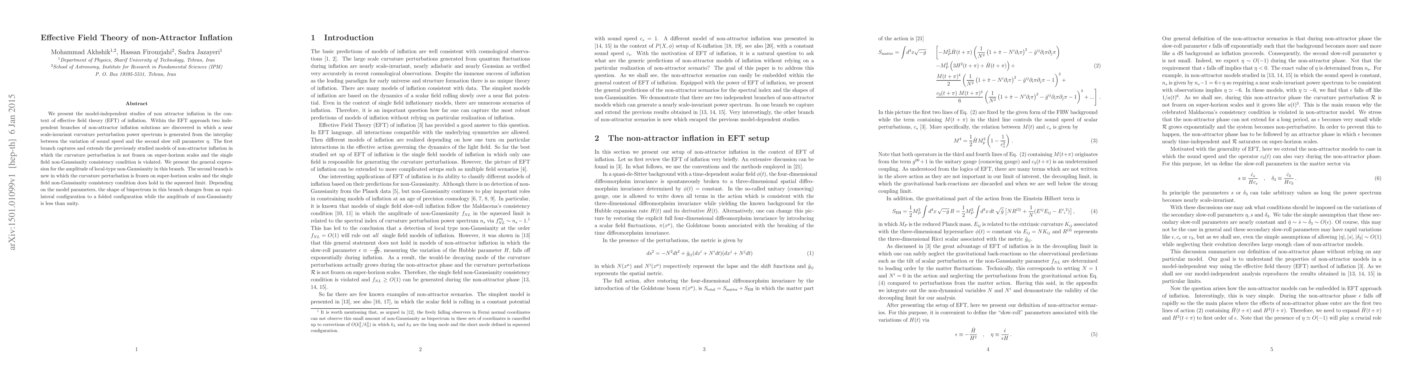 We present the model-independent studies of non attractor inflation in the context of effective field theory (EFT) of inflation. Within the EFT approach two independent branches of non-attractor inflation solutions are discovered in which a near scale-invariant curvature perturbation power spectrum is generated from the interplay between the variation of sound speed and the second slow roll parameter \eta. The first branch captures and extends the previously studied models of non-attractor inflation in which the curvature perturbation is not frozen on super-horizon scales and the single field non-Gaussianity consistency condition is violated. We present the general expression for the amplitude of local-type non-Gaussianity in this branch. The second branch is new in which the curvature perturbation is frozen on super-horizon scales and the single field non-Gaussianity consistency condition does hold in the squeezed limit. Depending on the model parameters, the shape of bispectrum in this branch changes from an equilateral configuration to a folded configuration while the amplitude of non-Gaussianity is less than unity.