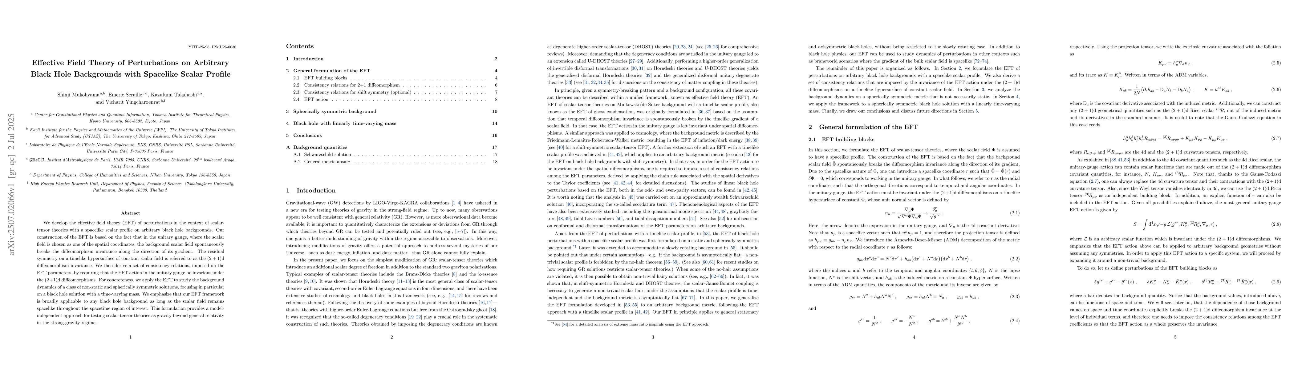 This research introduces an effective field theory (EFT) for perturbations on black hole backgrounds with a spacelike scalar field, utilizing a $(2+1)$d diffeomorphism invariance. The methodology applies to any black hole, providing a model-independent approach to test scalar-tensor theories in strong gravity regimes, with a focus on non-static, spherically symmetric solutions including black holes with time-varying mass.