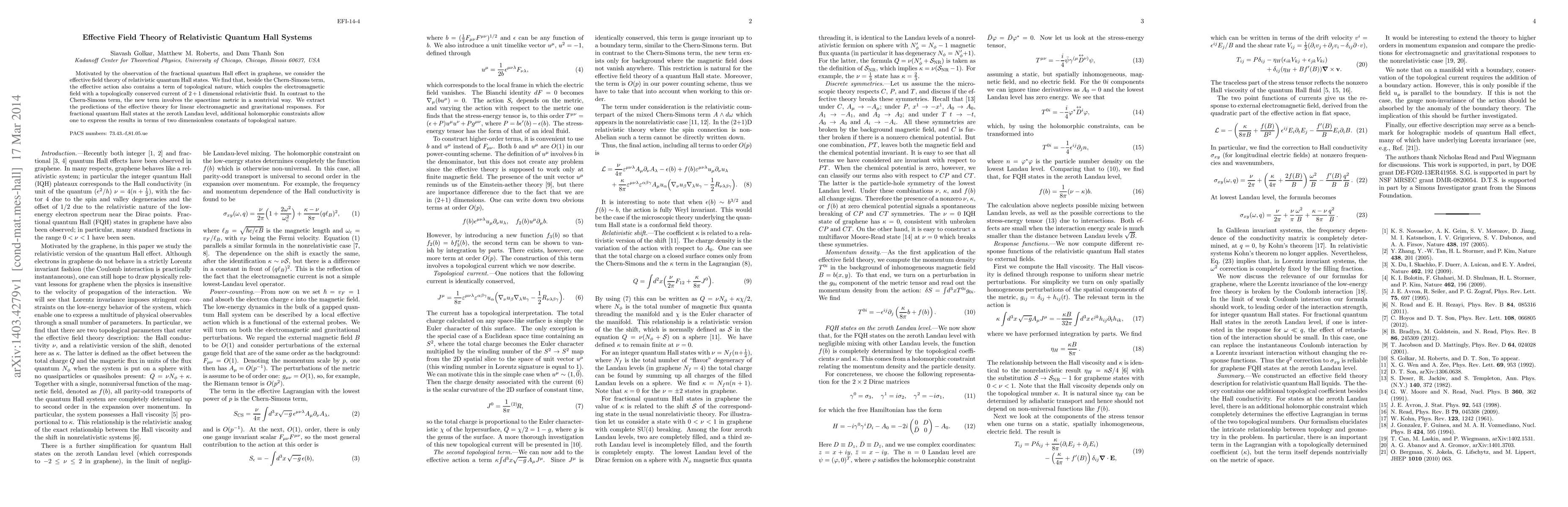 This paper develops an effective field theory for relativistic quantum Hall systems, particularly in graphene. It identifies a new topological term beyond the Chern-Simons term, which couples the electromagnetic field with a conserved current in a $2+1$ dimensional relativistic fluid, and predicts linear electromagnetic and gravitational responses.