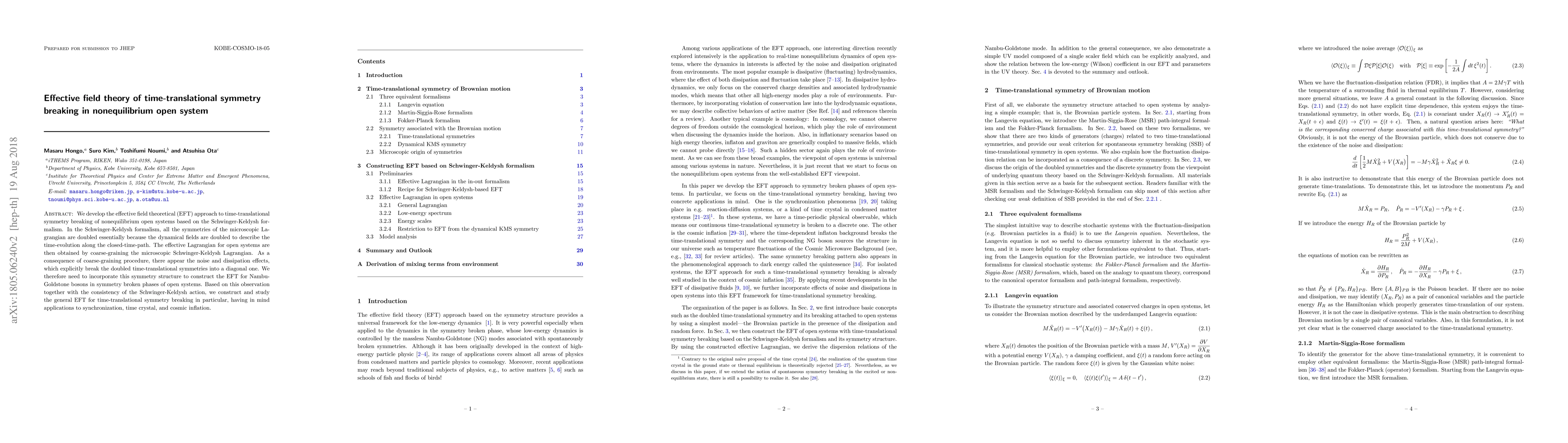 This paper develops an effective field theory (EFT) for time-translational symmetry breaking in nonequilibrium open systems using the Schwinger-Keldysh formalism. The EFT incorporates noise and dissipation effects, which break symmetries, and constructs an EFT for Nambu-Goldstone bosons in symmetry-broken phases, with potential applications to synchronization, time crystals, and cosmic inflation.