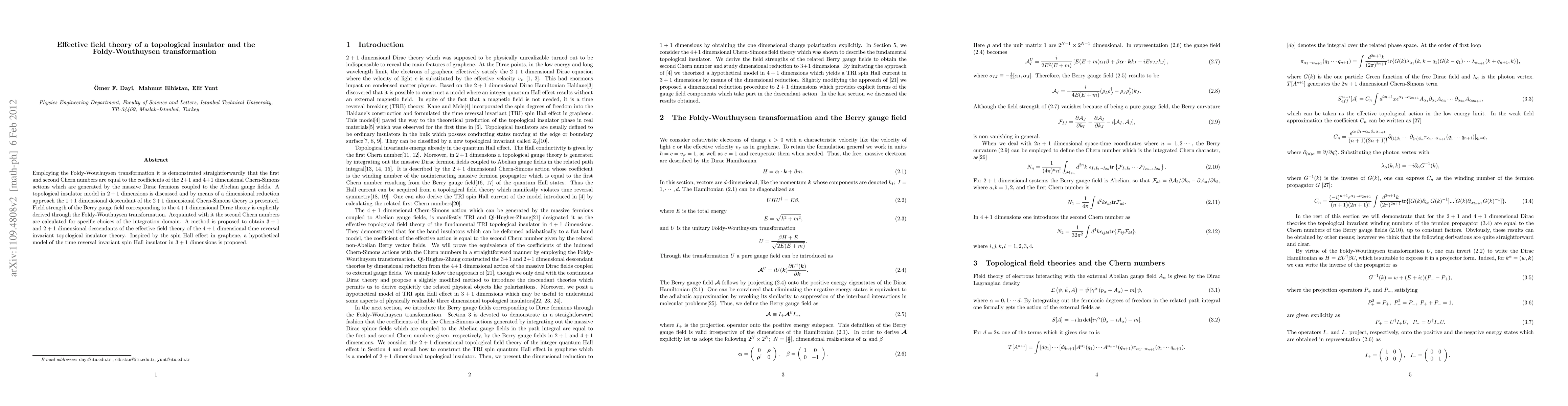 This paper employs the Foldy-Wouthuysen transformation to show that the Chern numbers in topological insulators correspond to coefficients in Chern-Simons actions for Dirac fermions coupled to Abelian gauge fields. It also proposes methods to derive lower-dimensional descendants of the effective field theory and hypothesizes a time reversal invariant spin Hall insulator in 3+1 dimensions.
