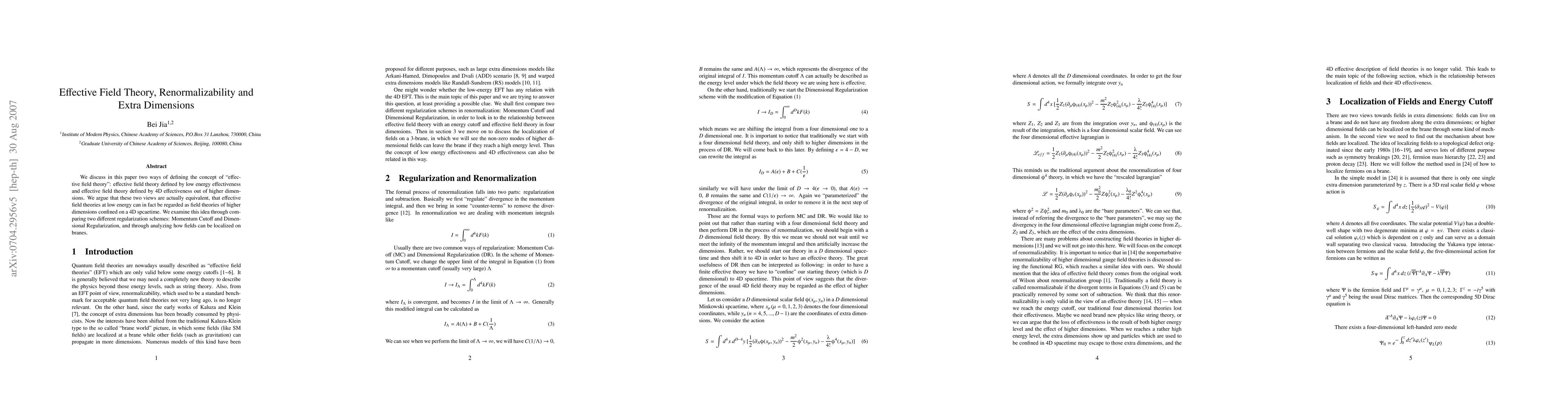 We discuss in this paper two ways of defining the concept of "effective field theory": effective field theory defined by low energy effectiveness and effective field theory defined by 4D effectiveness out of higher dimensions. We argue that these two views are actually equivalent, that effective field theories at low energy can in fact be regarded as field theories of higher dimensions confined on a 4D spcaetime. We examine this idea through comparing two different regularization schemes: Momentum Cutoff and Dimensional Regularization, and through analyzing how fields can be localized on branes.