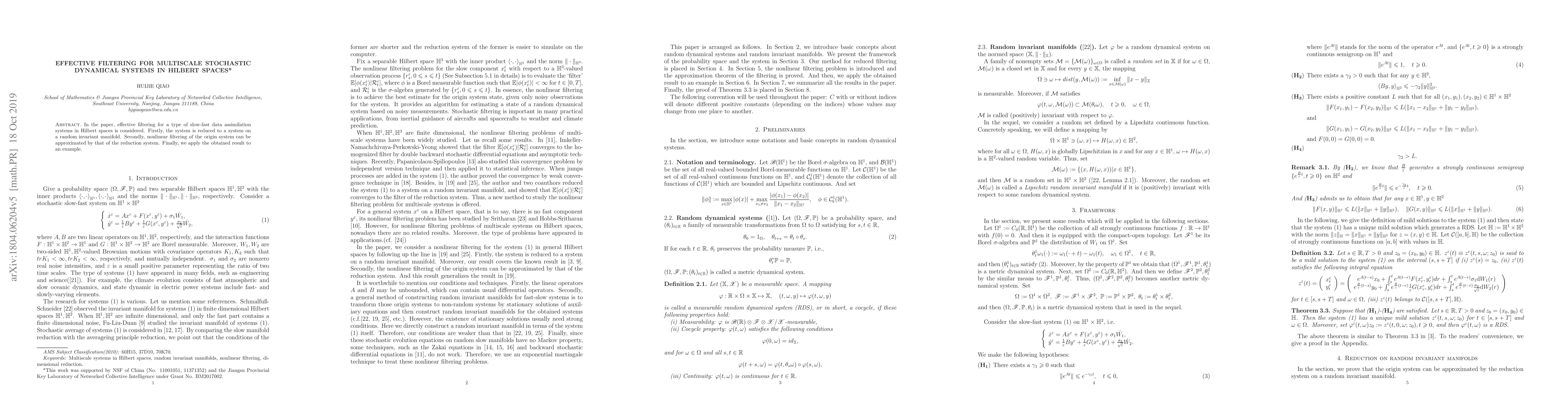 In the paper, effective filtering for a type of slow-fast data assimilation systems in Hilbert spaces is considered. Firstly, the system is reduced to a system on a random invariant manifold. Secondly, nonlinear filtering of the origin system can be approximated by that of the reduction system. Finally, we apply the obtained result to an example.
