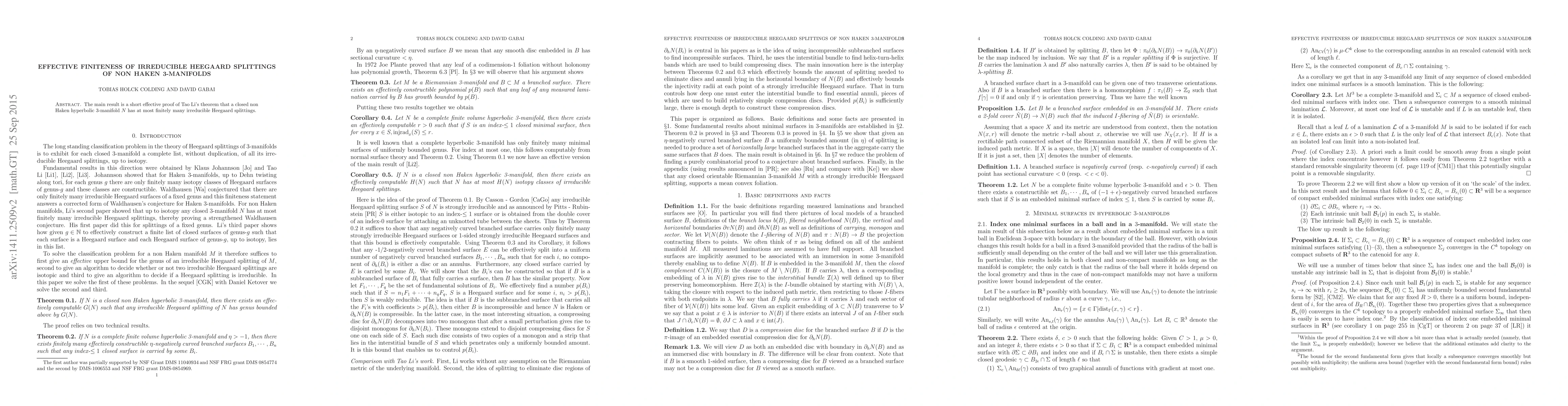 The main result is a short effective proof of Tao Li's theorem that a closed non Haken hyperbolic 3-manifold N has at most finitely many irreducible Heegaard splittings.