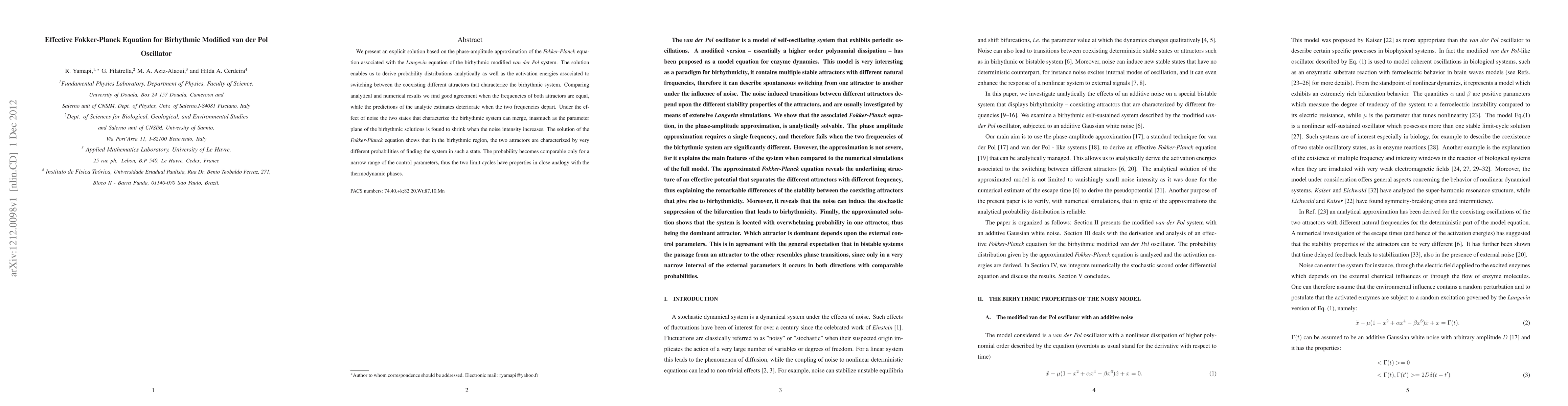 We present an explicit solution based on the phase-amplitude approximation of the Fokker-Planck equation associated with the Langevin equation of the birhythmic modified van der Pol system. The solution enables us to derive probability distributions analytically as well as the activation energies associated to switching between the coexisting different attractors that characterize the birhythmic system. Comparing analytical and numerical results we find good agreement when the frequencies of both attractors are equal, while the predictions of the analytic estimates deteriorate when the two frequencies depart. Under the effect of noise the two states that characterize the birhythmic system can merge, inasmuch as the parameter plane of the birhythmic solutions is found to shrink when the noise intensity increases. The solution of the Fokker-Planck equation shows that in the birhythmic region, the two attractors are characterized by very different probabilities of finding the system in such a state. The probability becomes comparable only for a narrow range of the control parameters, thus the two limit cycles have properties in close analogy with the thermodynamic phases.