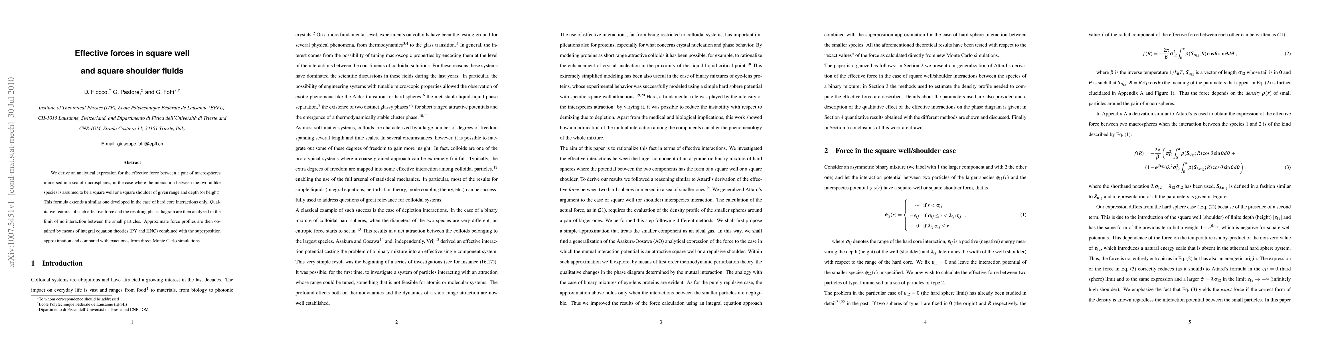 Researchers derived an analytical expression for effective force between macrospheres in square well and shoulder fluids, extending existing formulas to soft particle interactions. They compared the results with Monte Carlo simulations and integral equation theories.