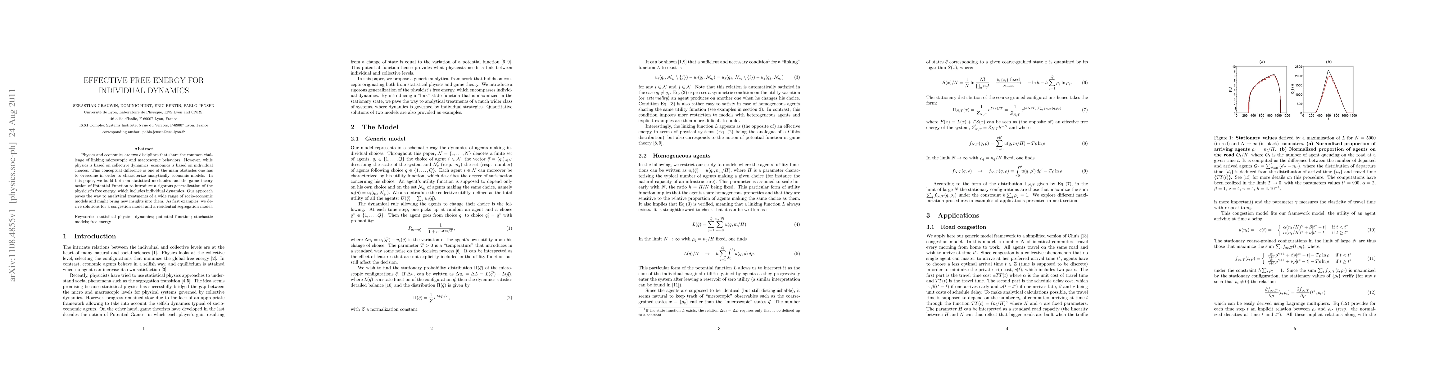 Physics and economics are two disciplines that share the common challenge of linking microscopic and macroscopic behaviors. However, while physics is based on collective dynamics, economics is based on individual choices. This conceptual difference is one of the main obstacles one has to overcome in order to characterize analytically economic models. In this paper, we build both on statistical mechanics and the game theory notion of Potential Function to introduce a rigorous generalization of the physicist's free energy, which includes individual dynamics. Our approach paves the way to analytical treatments of a wide range of socio-economic models and might bring new insights into them. As first examples, we derive solutions for a congestion model and a residential segregation model.