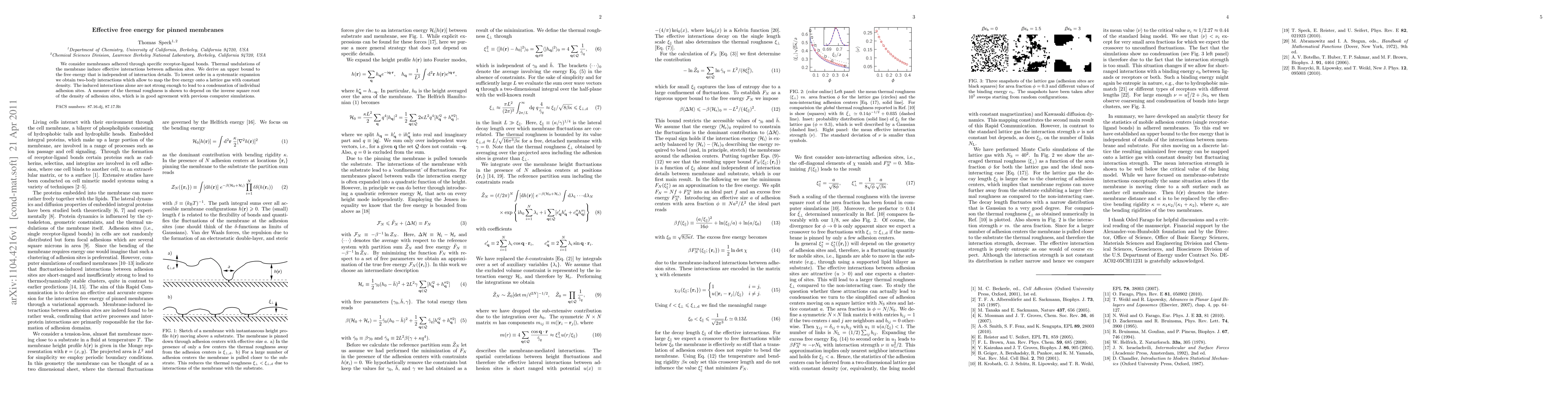 Researchers found that thermal undulations on pinned membranes create effective interactions between adhesion sites, allowing for a lattice gas model to describe the free energy. This model predicts a relationship between membrane roughness and adhesion site density, in agreement with previous simulations.