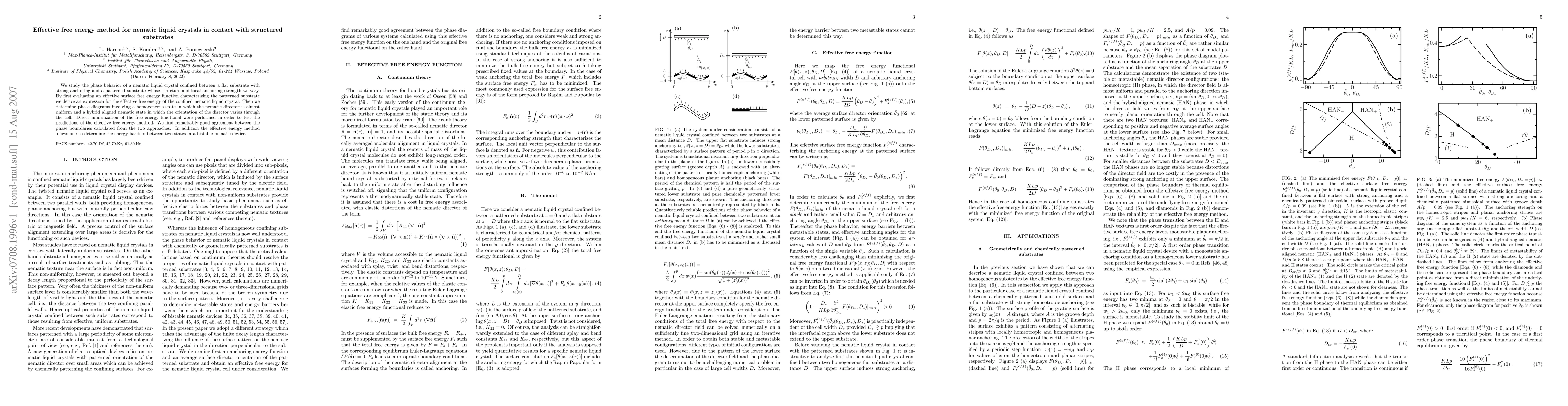 This paper develops an effective free energy method to study the phase behavior of nematic liquid crystals in contact with structured substrates. The method accurately predicts phase diagrams and energy barriers in nematic devices, showing good agreement with direct free energy minimization.