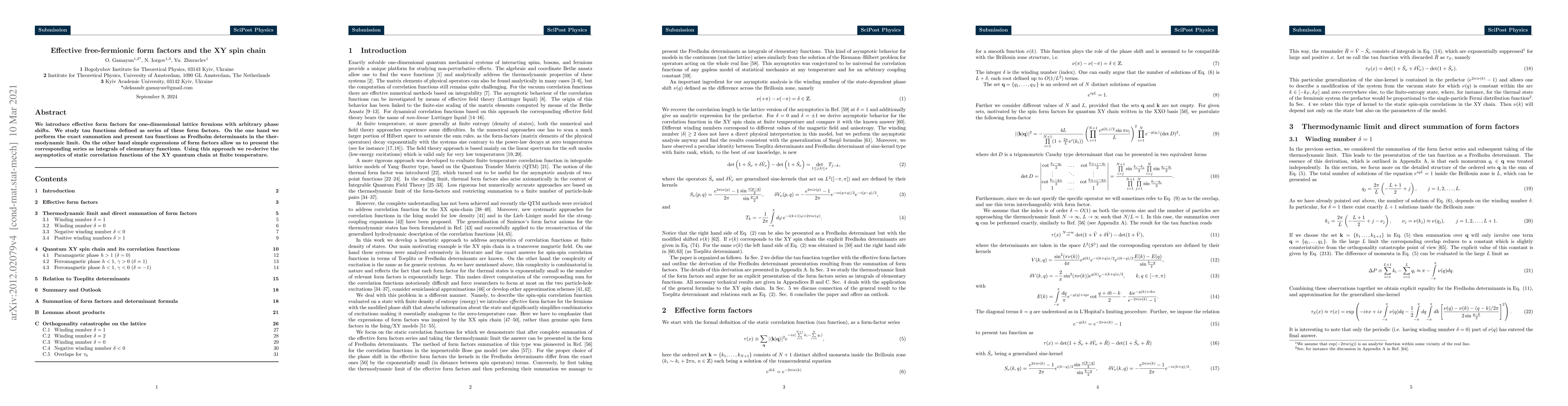 We introduce effective form factors for one-dimensional lattice fermions with arbitrary phase shifts. We study tau functions defined as series of these form factors. On the one hand we perform the exact summation and present tau functions as Fredholm determinants in the thermodynamic limit. On the other hand simple expressions of form factors allow us to present the corresponding series as integrals of elementary functions. Using this approach we re-derive the asymptotics of static correlation functions of the XY quantum chain at finite temperature.