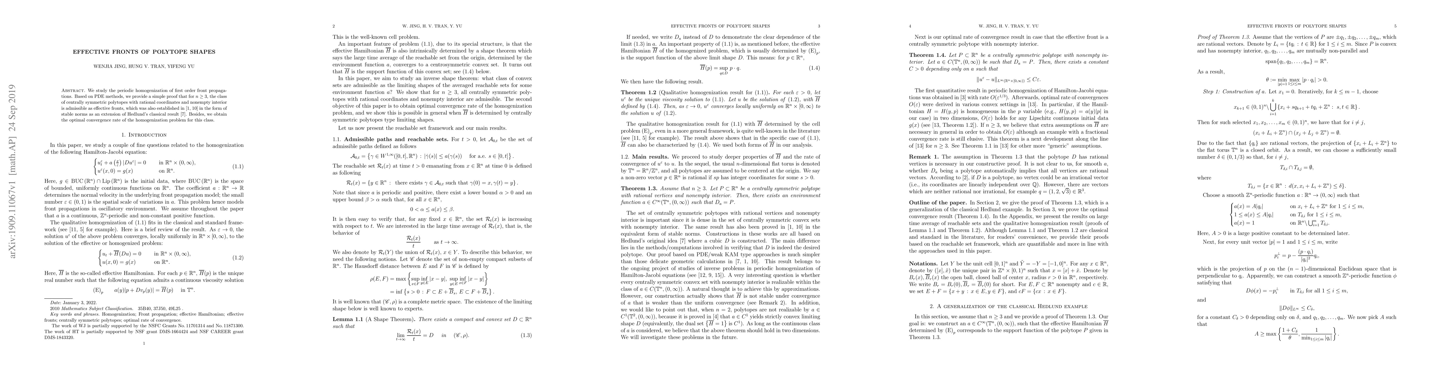 We study the periodic homogenization of first order front propagations. Based on PDE methods, we provide a simple proof that for $n \geq 3$, the class of centrally symmetric polytopes with rational coordinates and nonempty interior is admissible as effective fronts, which was also established in [1,10] in the form of stable norms as an extension of Hedlund's classical result [7]. Besides, we obtain the optimal convergence rate of the homogenization problem for this class.