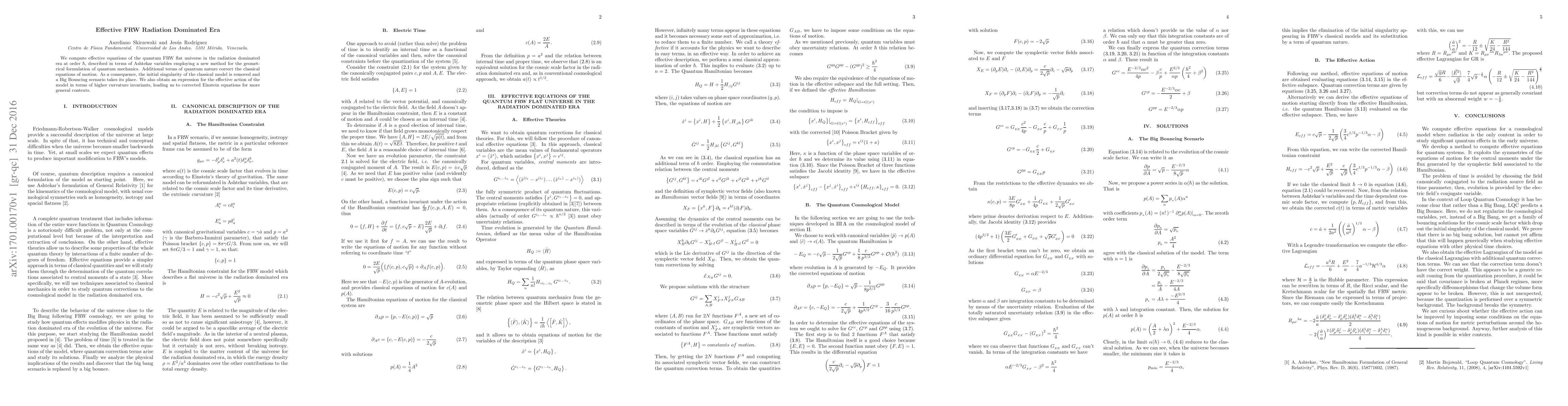 This paper computes effective quantum equations for a flat FRW universe in the radiation dominated era using Ashtekar variables, revealing quantum corrections that replace the classical initial singularity with a Big Bouncing scenario and derive corrected Einstein equations incorporating higher curvature invariants.