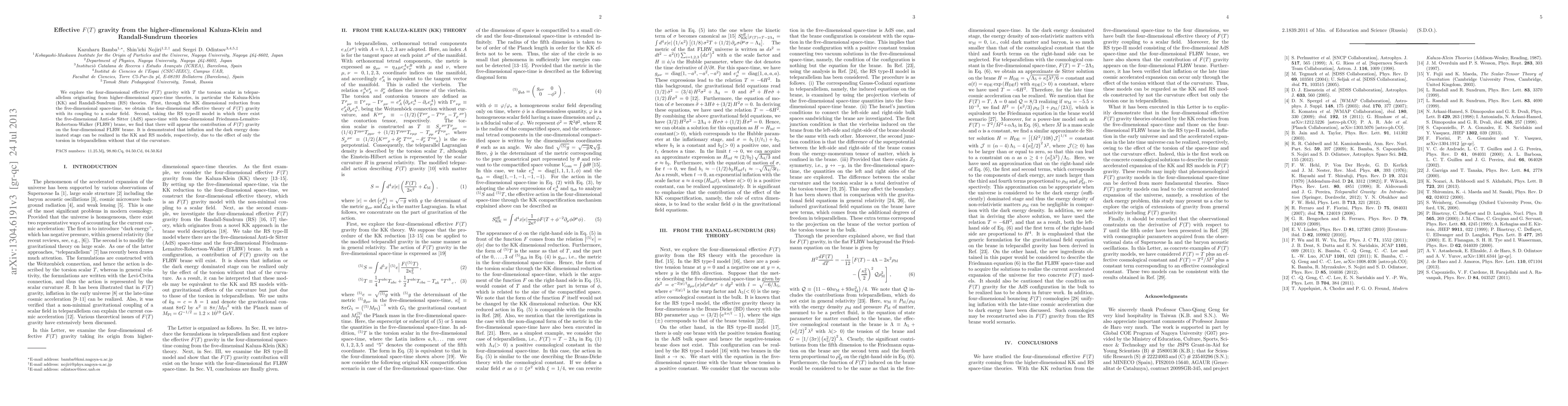This paper investigates four-dimensional $F(T)$ gravity derived from higher-dimensional Kaluza-Klein and Randall-Sundrum theories, showing how torsion scalar influences inflation and dark energy stages, respectively, without relying on curvature effects.