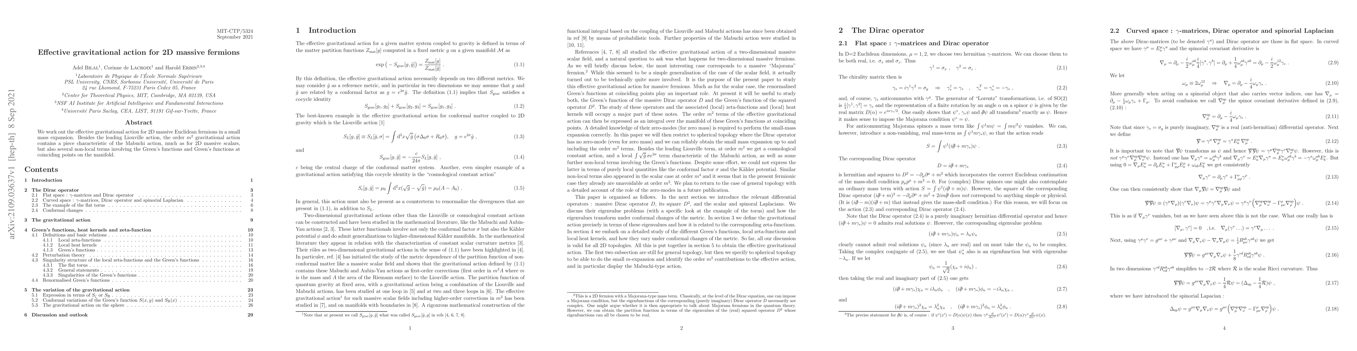 This paper derives the effective gravitational action for 2D massive Euclidean fermions in a small mass expansion, revealing a leading Liouville action and an $m^2$ order term similar to the Mabuchi action, along with several non-local terms involving Green's functions.