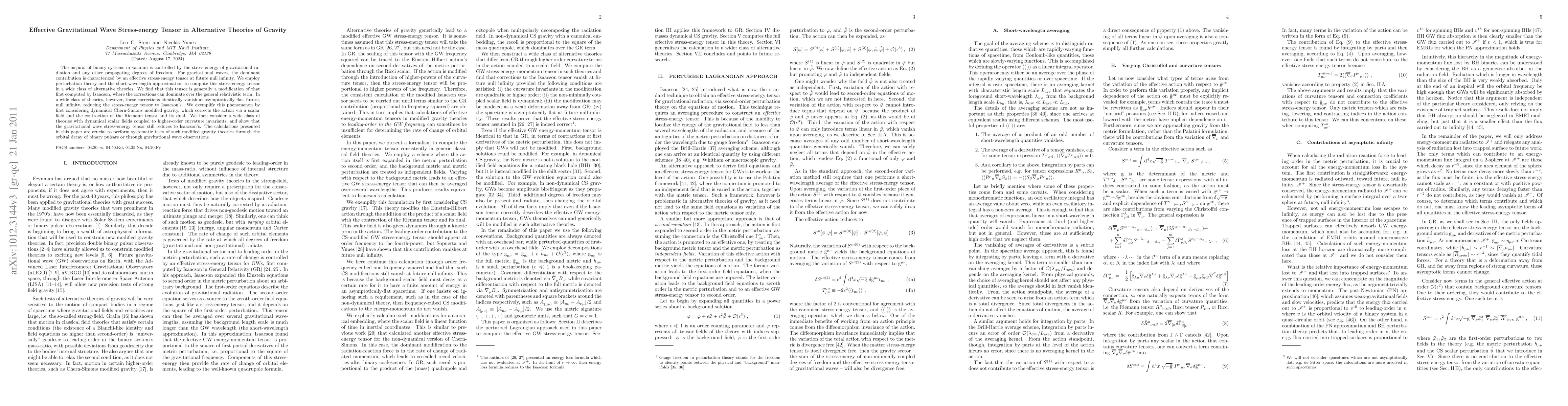 The inspiral of binary systems in vacuum is controlled by the stress-energy of gravitational radiation and any other propagating degrees of freedom. For gravitational waves, the dominant contribution is characterized by an effective stress-energy tensor at future null infinity. We employ perturbation theory and the short-wavelength approximation to compute this stress-energy tensor in a wide class of alternative theories. We find that this tensor is generally a modification of that first computed by Isaacson, where the corrections can dominate over the general relativistic term. In a wide class of theories, however, these corrections identically vanish at asymptotically flat, future, null infinity, reducing the stress-energy tensor to Isaacson's. We exemplify this phenomenon by first considering dynamical Chern-Simons modified gravity, which corrects the action via a scalar field and the contraction of the Riemann tensor and its dual. We then consider a wide class of theories with dynamical scalar fields coupled to higher-order curvature invariants, and show that the gravitational wave stress-energy tensor still reduces to Isaacson's. The calculations presented in this paper are crucial to perform systematic tests of such modified gravity theories through the orbital decay of binary pulsars or through gravitational wave observations.