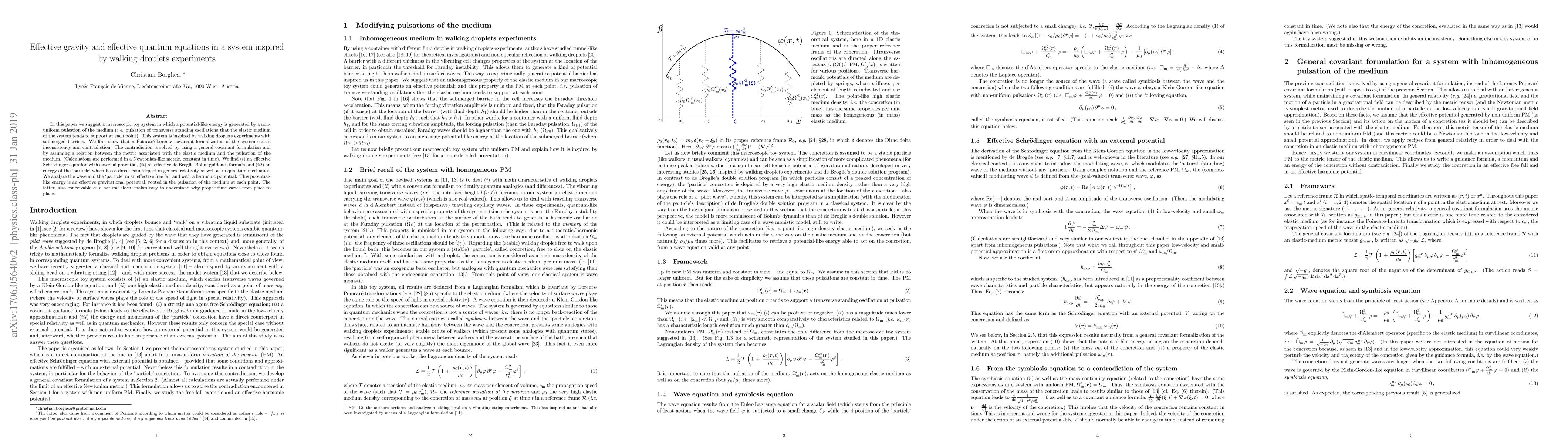 In this paper we suggest a macroscopic toy system in which a potential-like energy is generated by a non-uniform pulsation of the medium (i.e. pulsation of transverse standing oscillations that the elastic medium of the system tends to support at each point). This system is inspired by walking droplets experiments with submerged barriers. We first show that a Poincar\'e-Lorentz covariant formalization of the system causes inconsistency and contradiction. The contradiction is solved by using a general covariant formulation and by assuming a relation between the metric associated with the elastic medium and the pulsation of the medium. (Calculations are performed in a Newtonian-like metric, constant in time). We find ($i$) an effective Schr\"odinger equation with external potential, ($ii$) an effective de Broglie-Bohm guidance formula and ($iii$) an energy of the `particle' which has a direct counterpart in general relativity as well as in quantum mechanics. We analyze the wave and the `particle' in an effective free fall and with a harmonic potential. This potential-like energy is an effective gravitational potential, rooted in the pulsation of the medium at each point. The latter, also conceivable as a natural clock, makes easy to understand why proper time varies from place to place.