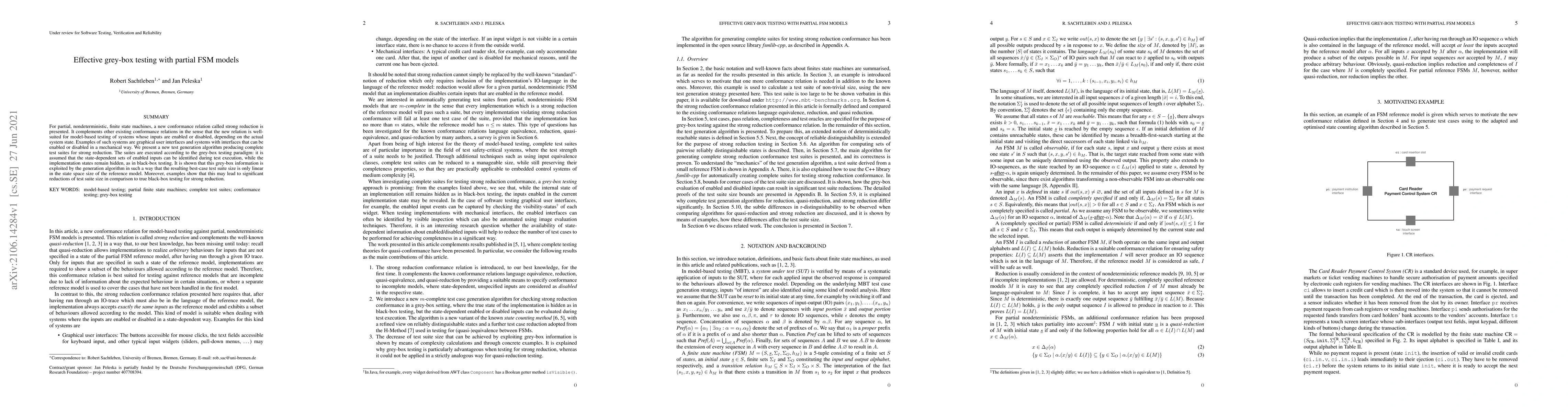 This paper introduces a new conformance relation called strong reduction for testing partial, nondeterministic finite state machines, and presents a test generation algorithm that produces complete test suites under a grey-box testing paradigm, achieving linear test suite size relative to the state space, often leading to significant reductions compared to traditional black-box testing.