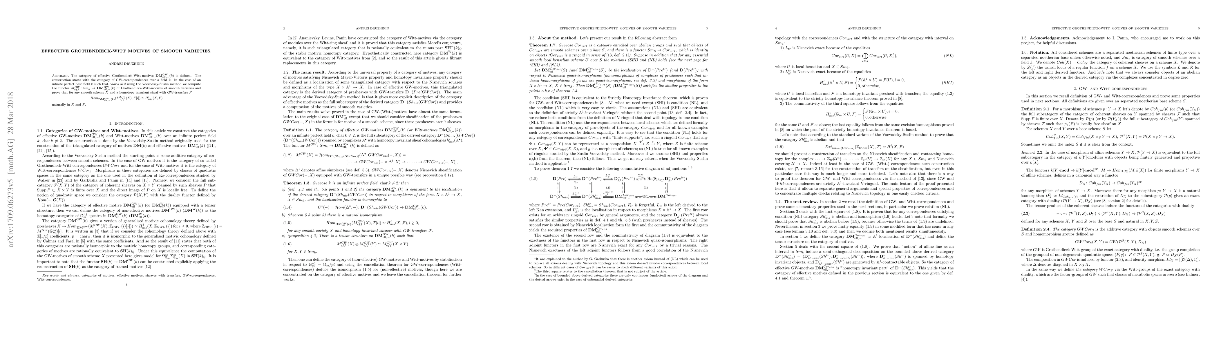 This paper defines the category of effective Grothendieck-Witt motives of smooth varieties using Voevodsky-Suslin methods and computes the functor that maps smooth varieties to these motives. It proves a natural isomorphism between the Hom functor of effective Grothendieck-Witt motives and the niskov cohomology with GW-transfers.