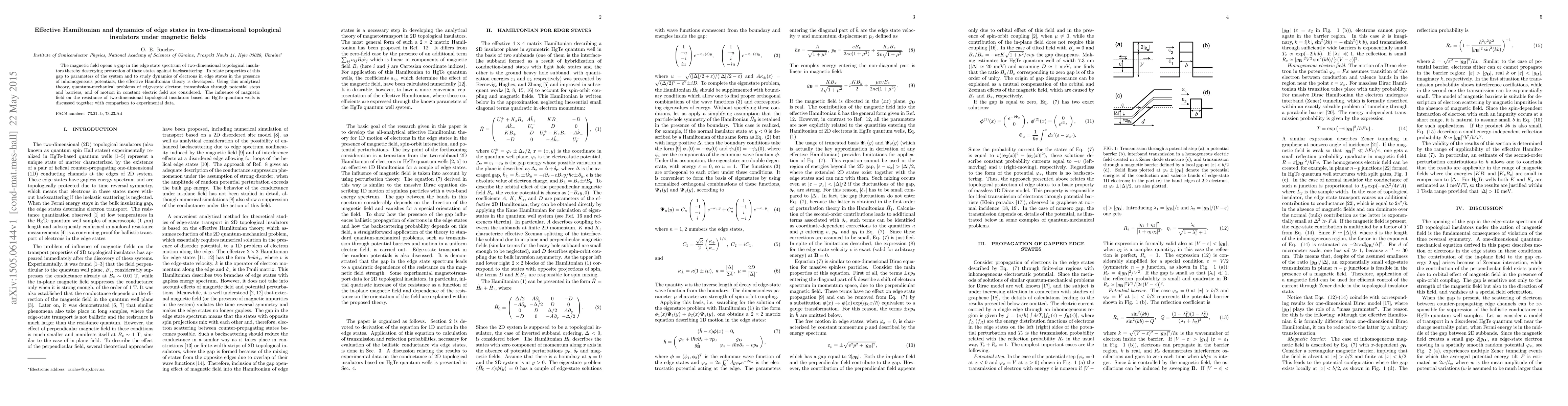 The research develops an effective Hamiltonian to study the dynamics of edge states in two-dimensional topological insulators under magnetic fields, focusing on electron transmission and motion, and compares theoretical predictions with experimental data on HgTe quantum wells. Magnetic fields impact the gap and resistance of these materials, affecting their topological protection.