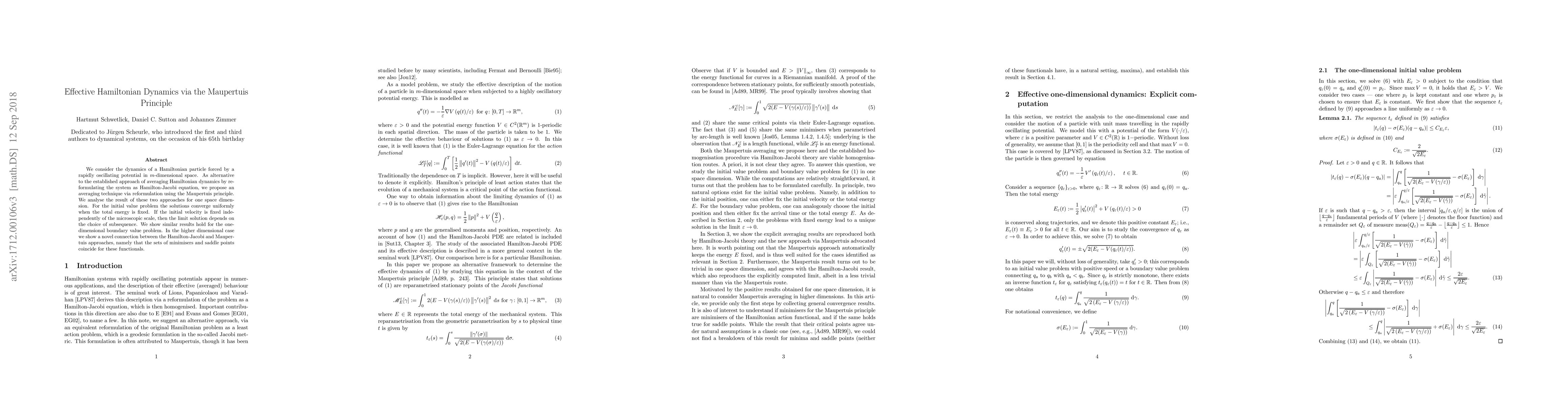 We consider the dynamics of a Hamiltonian particle forced by a rapidly oscillating potential in $\dim$-dimensional space. As alternative to the established approach of averaging Hamiltonian dynamics by reformulating the system as Hamilton-Jacobi equation, we propose an averaging technique via reformulation using the Maupertuis principle. We analyse the result of these two approaches for one space dimension. For the initial value problem the solutions converge uniformly when the total energy is fixed. If the initial velocity is fixed independently of the microscopic scale, then the limit solution depends on the choice of subsequence. We show similar results hold for the one-dimensional boundary value problem. In the higher dimensional case we show a novel connection between the Hamilton-Jacobi and Maupertuis approaches, namely that the sets of minimisers and saddle points coincide for these functionals.
