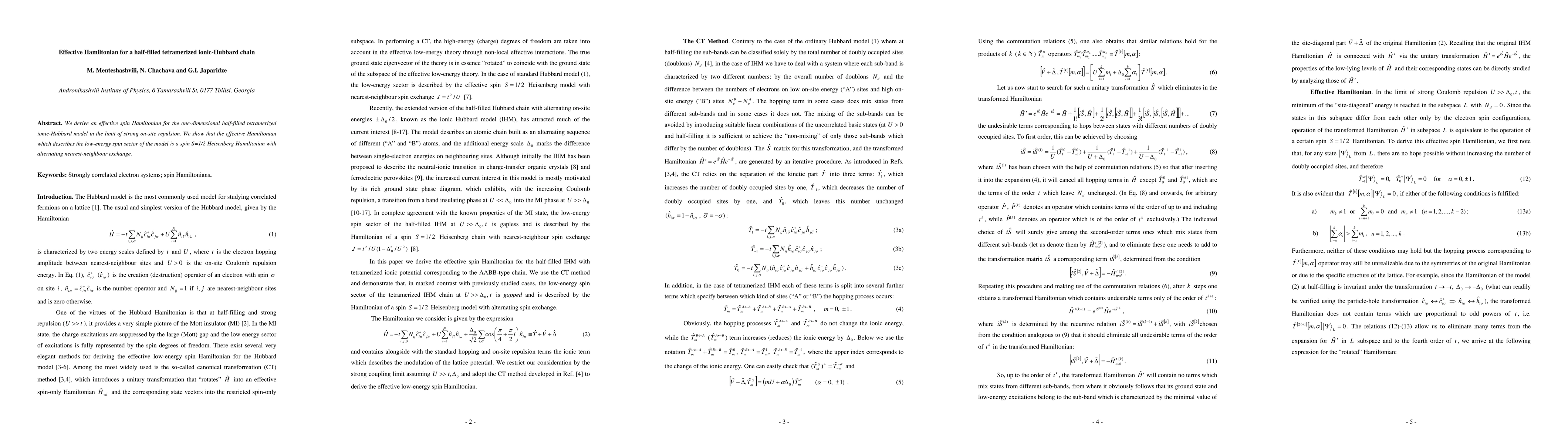 This paper derives an effective spin Hamiltonian for a one-dimensional half-filled tetramerized ionic-Hubbard chain under strong on-site repulsion, revealing it as a spin S=1/2 Heisenberg model with alternating nearest-neighbour exchange.