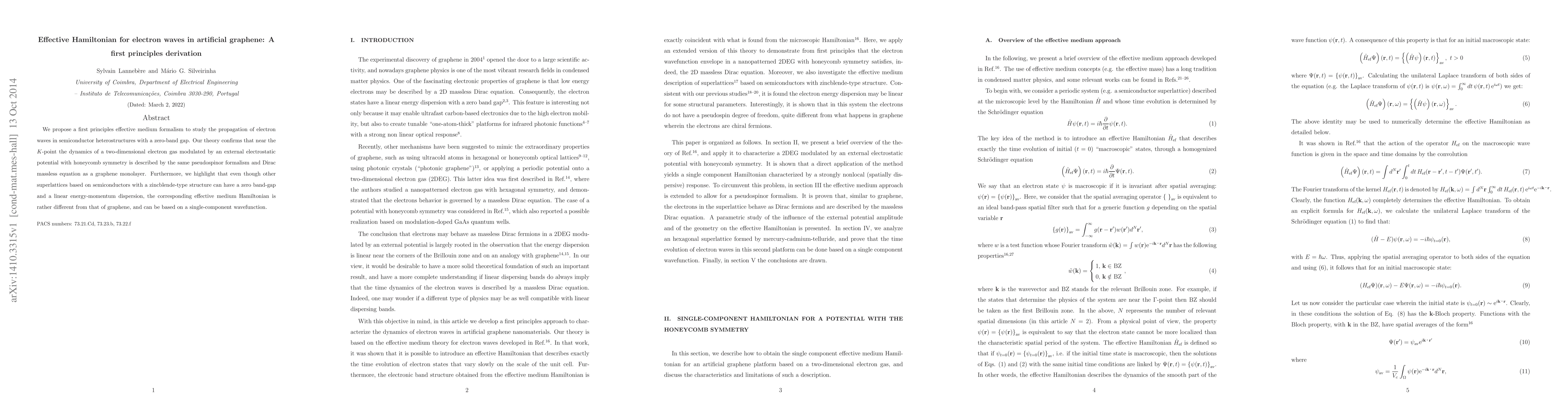 We propose a first principles effective medium formalism to study the propagation of electron waves in semiconductor heterostructures with a zero-band gap. Our theory confirms that near the K-point the dynamics of a two-dimensional electron gas modulated by an external electrostatic potential with honeycomb symmetry is described by the same pseudospinor formalism and Dirac massless equation as a graphene monolayer. Furthermore, we highlight that even though other superlattices based on semiconductors with a zincblende-type structure can have a zero band-gap and a linear energy-momentum dispersion, the corresponding effective medium Hamiltonian is rather different from that of graphene, and can be based on a single-component wavefunction.