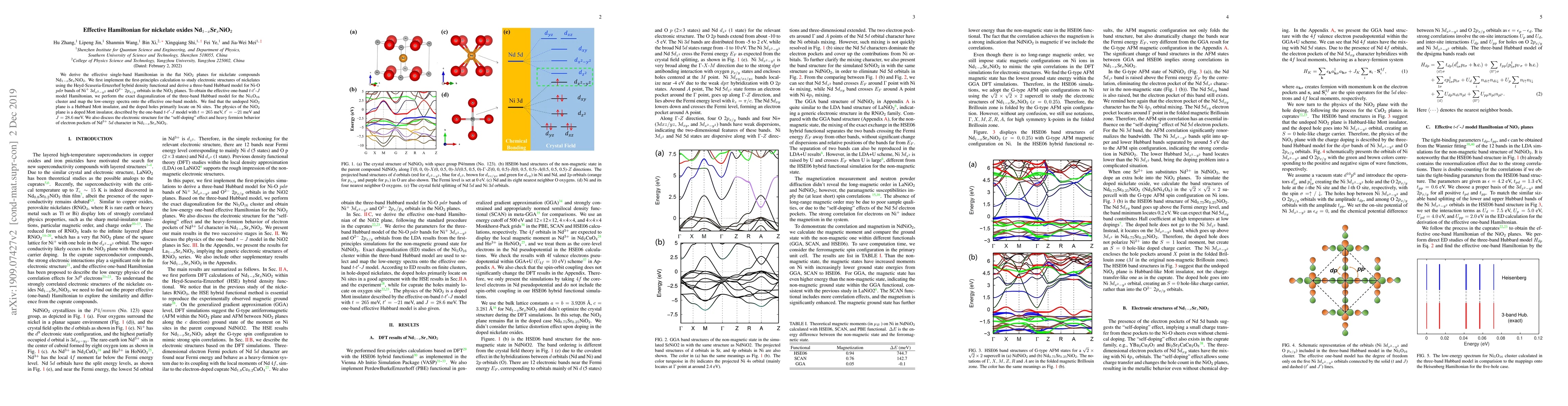 We derive the effective single-band Hamiltonian in the flat NiO$_2$ planes for nickelate compounds Nd$_{1-x}$Sr$_x$NiO$_2$. We first implement the first-principles calculation to study electronic structures of nickelates using the Heyd-Scuseria-Ernzerhof hybrid density functional and derive a three-band Hubbard model for Ni-O $pd\sigma$ bands of Ni$^+$ $3d_{x^2-y^2}$ and O$^{2-}$ $2p_{x/y}$ orbitals in the NiO$_2$ planes. To obtain the effective one-band $t$-$t'$-$J$ model Hamiltonian, we perform the exact diagonalization of the three-band Hubbard model for the Ni$_5$O$_{16}$ cluster and map the low-energy spectra onto the effective one-band models. We find that the undoped NiO$_2$ plane is a Hubbard Mott insulator, and the doped holes primarily locate on Ni sites. The physics of the NiO$_2$ plane is a doped Mott insulator, described by the one-band $t$-$t'$-$J$ model with $t=265$~meV, $t'=-21$~meV and $J=28.6$~meV. We also discuss the electronic structure for the "self-doping" effect and heavy fermion behavior of electron pockets of Nd$^{3+}$ $5d$ character in Nd$_{1-x}$Sr$_x$NiO$_2$.