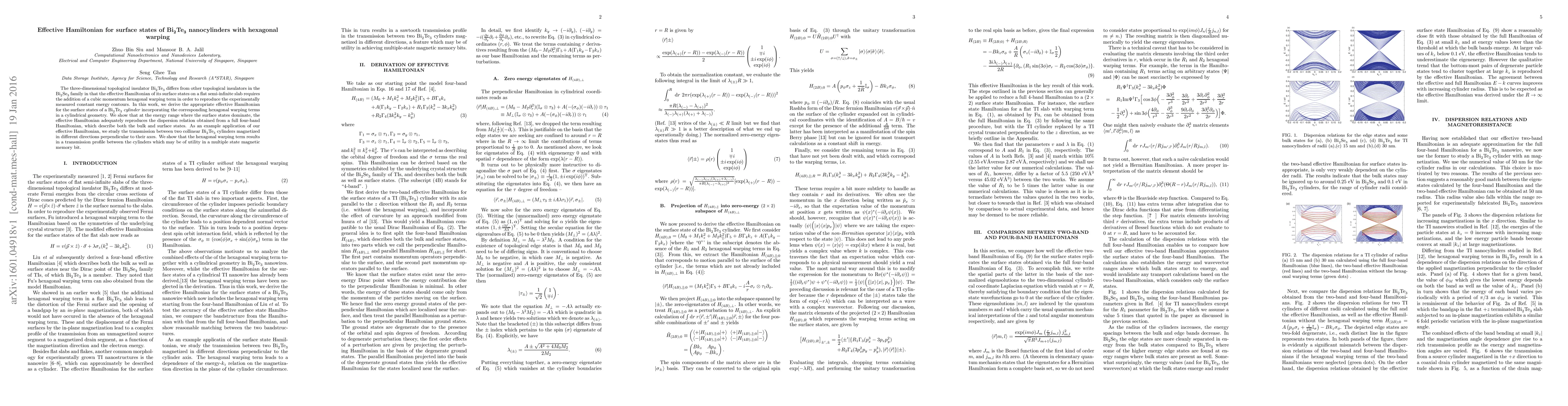 This paper derives an effective Hamiltonian for \ce{Bi2Te3} nanocylinder surface states, incorporating hexagonal warping to match experimental dispersion relations. The model accurately reproduces the full four-band Hamiltonian's dispersion and is applied to study transmission between magnetized cylinders, suggesting potential for multi-state magnetic memory applications.