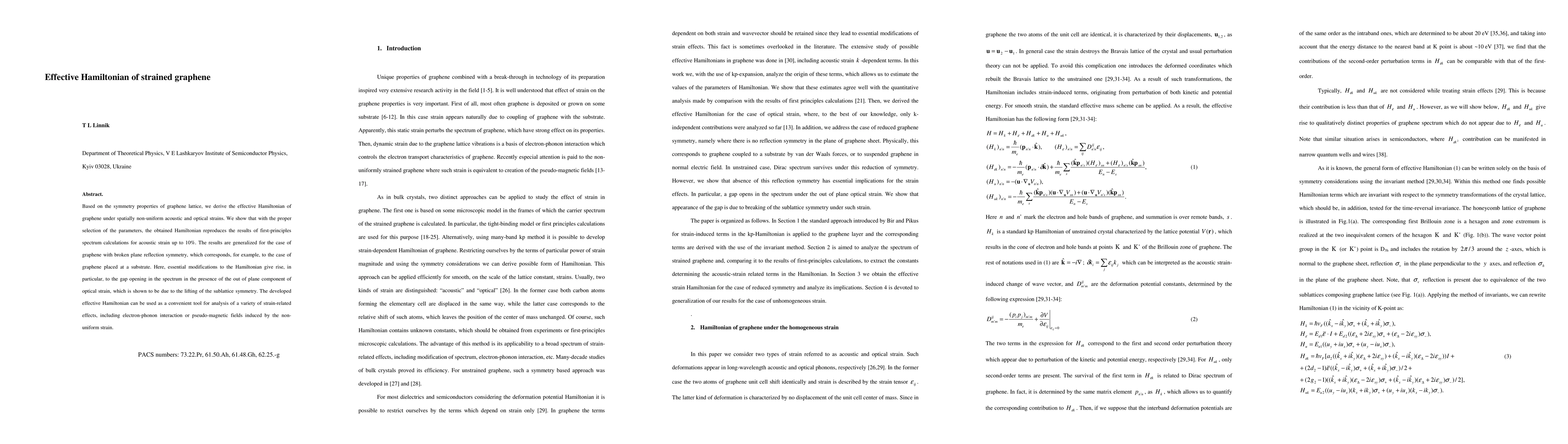 The paper derives an effective Hamiltonian for strained graphene that accurately reproduces first-principles calculations under acoustic strain up to 10%. It also accounts for optical strain effects, particularly the gap opening due to broken plane reflection symmetry and lifting of sublattice symmetry, useful for analyzing strain-related phenomena.