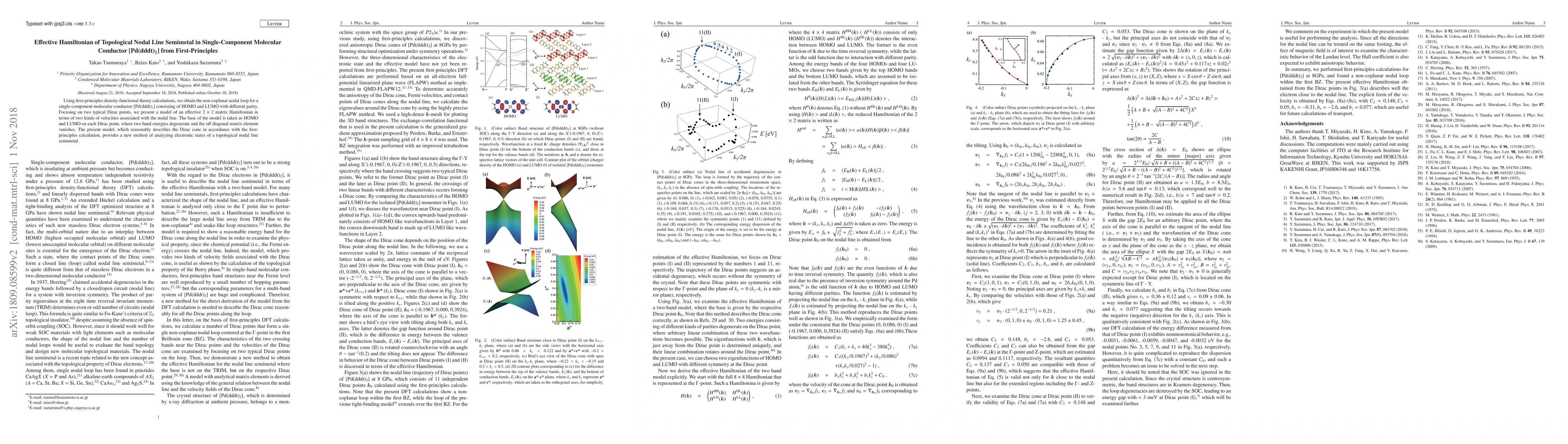 This paper uses first-principles density-functional theory to analyze the electronic structure of the single-component molecular conductor [Pd(dddt)₂], revealing a non-coplanar nodal loop. It presents an effective 2 × 2 matrix Hamiltonian model to describe the topological nodal line semimetal, based on the HOMO and LUMO bands, providing a new method for analyzing such electronic states.