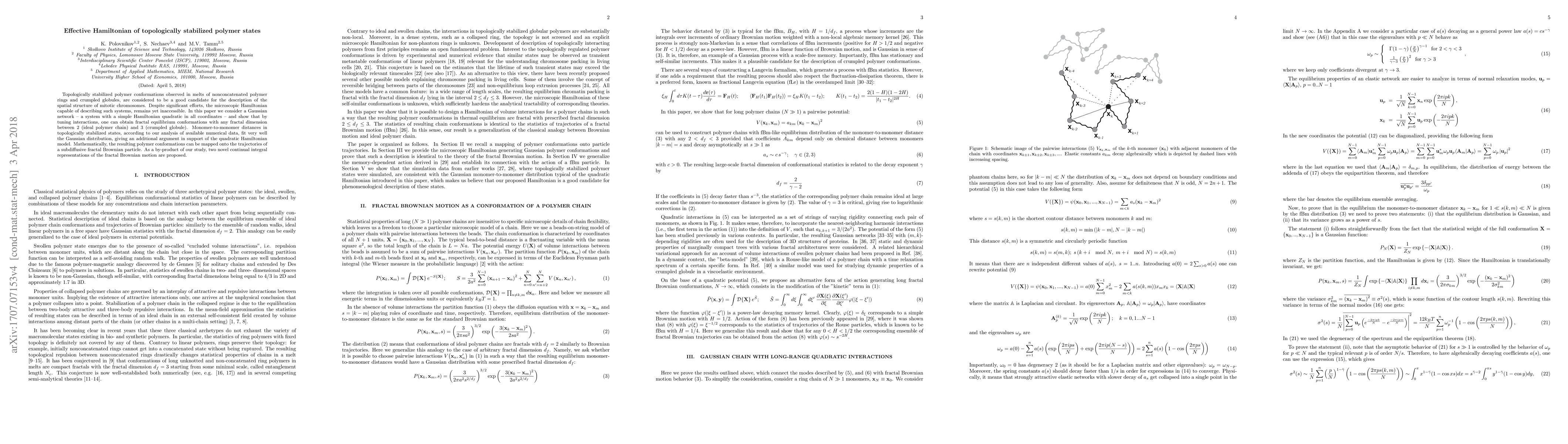 Topologically stabilized polymer conformations observed in melts of nonconcatenated polymer rings and crumpled globules, are considered to be a good candidate for the description of the spatial structure of mitotic chromosomes. Despite significant efforts, the microscopic Hamiltonian capable of describing such systems, remains yet inaccessible. In this paper we consider a Gaussian network - a system with a simple Hamiltonian quadratic in all coordinates - and show that by tuning interactions, one can obtain fractal equilibrium conformations with any fractal dimension between 2 (ideal polymer chain) and 3 (crumpled globule). Monomer-to-monomer distances in topologically stabilized states, according to our analysis of available numerical data, fit very well the Gaussian distribution, giving an additional argument in support of the quadratic Hamiltonian model. Mathematically, the resulting polymer conformations can be mapped onto the trajectories of a subdiffusive fractal Brownian particle. As a by-product of our study, two novel continual integral representations of the fractal Brownian motion are proposed.