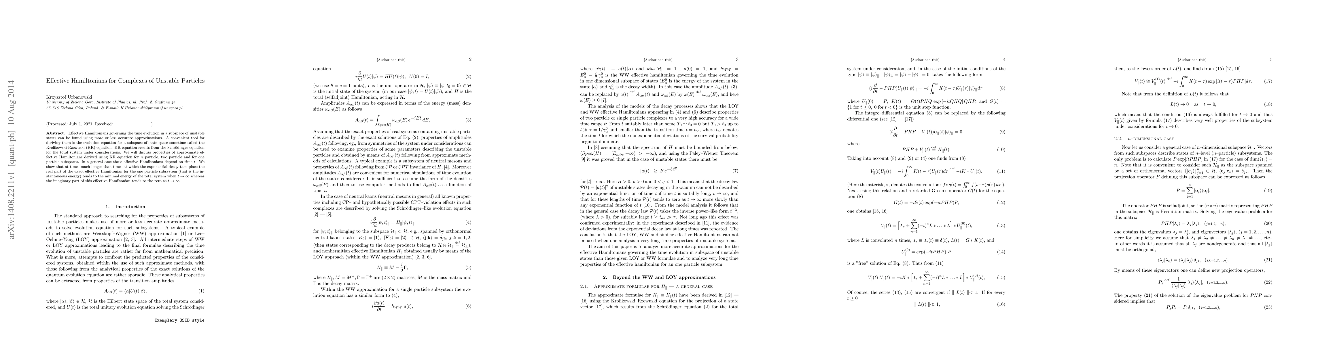 This paper explores effective Hamiltonians for unstable particle complexes, derived via the Krolikowski-Rzewuski (KR) equation, which approximates the time evolution in subspaces of unstable states. It demonstrates that for long times, the real part of the effective Hamiltonian approaches the total system's minimal energy, while the imaginary part tends to zero.