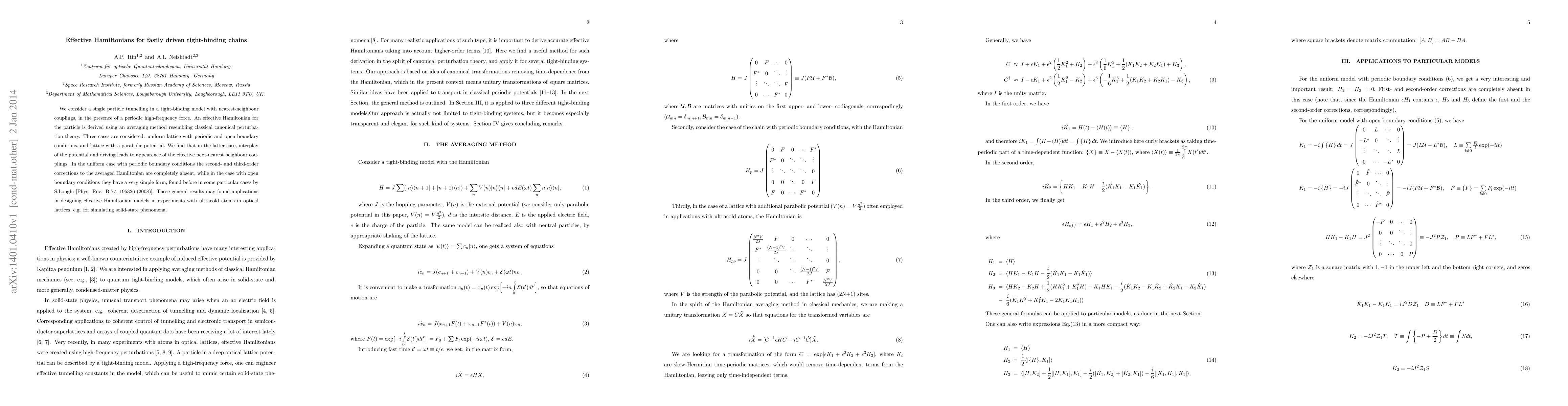 Researchers developed an effective Hamiltonian model to describe a particle in a tight-binding chain under high-frequency driving forces, revealing new insights into the interplay between potential and driving forces.