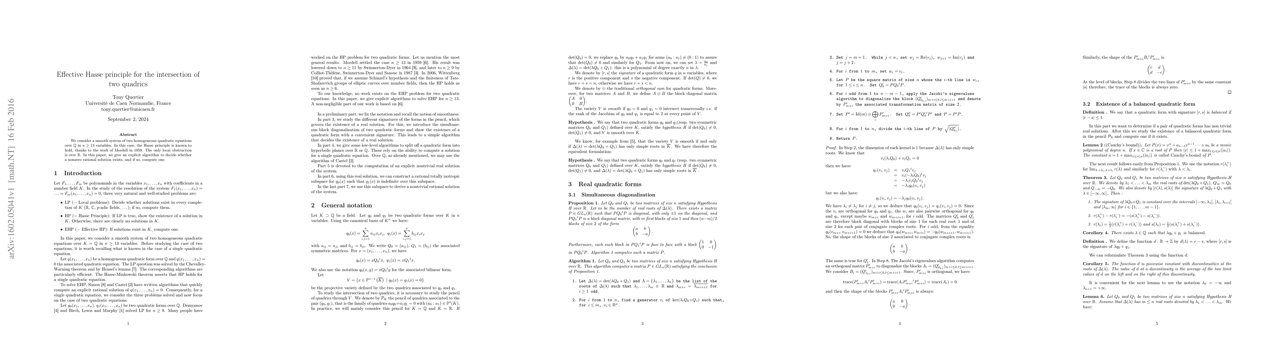 We consider a smooth system of two homogeneous quadratic equations over the rationals in at least 13 variables. In this case, the Hasse principle is known to hold, thanks to the work of Mordell in 1959. The only local obstruction is over the reals. In this paper, we give an explicit algorithm to decide whether a nonzero rational solution exists, and if so, to compute one.