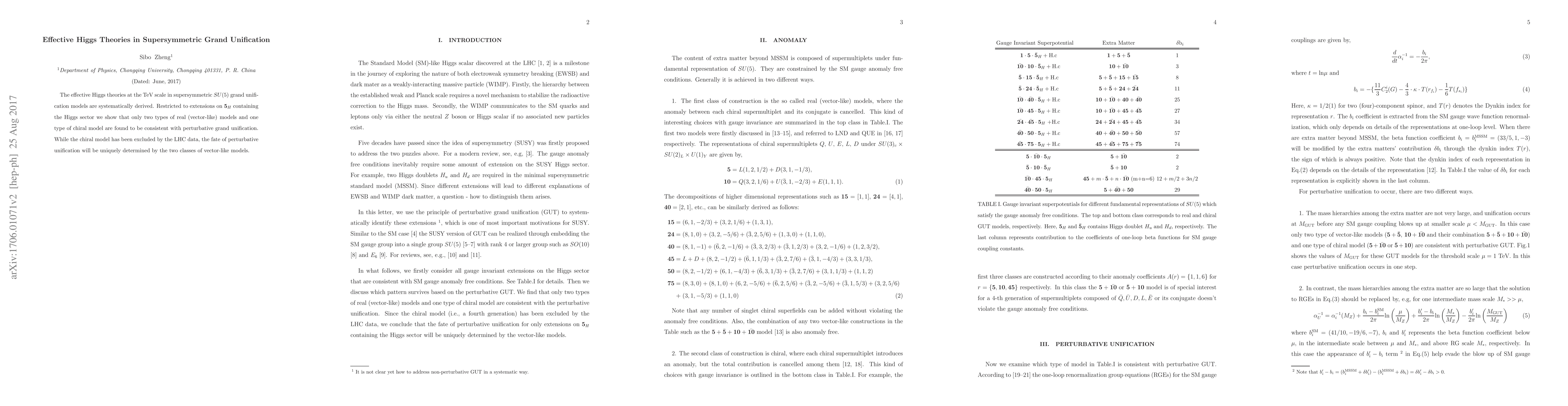 This paper systematically derives effective Higgs theories in supersymmetric $SU(5)$ grand unification models, identifying two types of vector-like models and one chiral model consistent with perturbative unification. The chiral model is excluded by LHC data, leaving the fate of perturbative unification to depend on the two vector-like models.