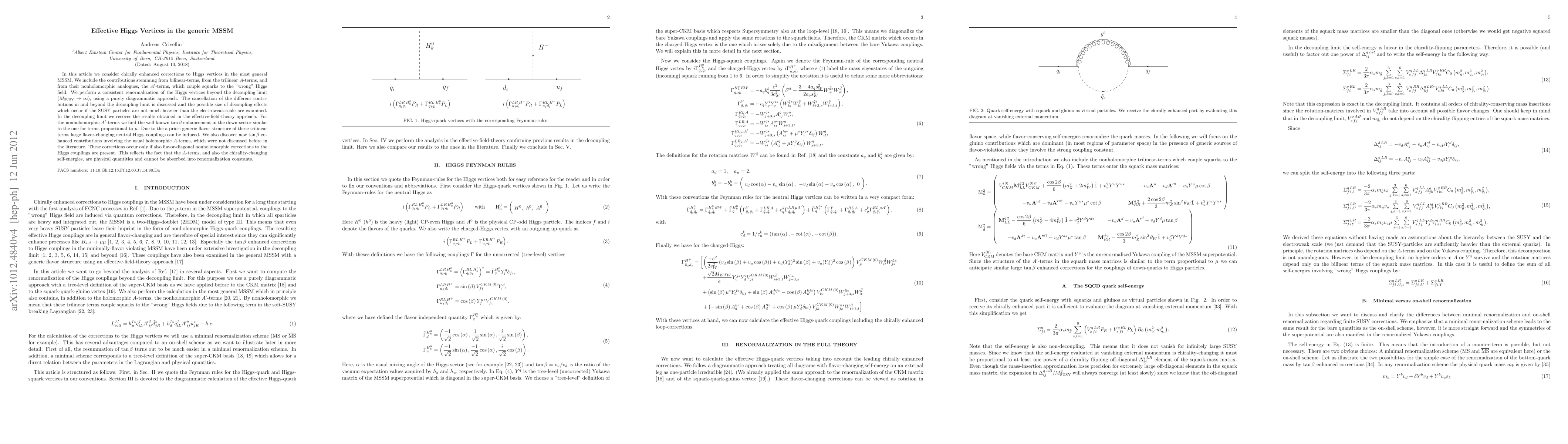 In this article we consider chirally enhanced corrections to Higgs vertices in the most general MSSM. We include the contributions stemming from bilinear-terms, from the trilinear A-terms and their non-holomorphic analogues, the A'-terms, which couple squarks to the "wrong" Higgs field. We perform a consistent renormalization of the Higgs vertices beyond the decoupling limit M_SUSY->infinity, using a purely diagrammatic approach. The cancellation of the different contributions in and beyond the decoupling limit is discussed and the possible size of decoupling effects which occur if the SUSY particles are not much heavier than the electroweak-scale are examined. In the decoupling limit we recover the results obtained in the effective-field-theory approach. For the non-holomorphic A'-terms we find the well known $\tan\beta$ enhancement in the down-sector similar to the one for terms proportional to mu. Due to the a priori generic flavor structure of these trilinear terms large flavour-changing neutral Higgs couplings can be induced. We also discover new tan(beta) enhanced contributions involving the usual holomorphic A-terms, which were not discussed before in the literature. These corrections occur only if also flavor-diagonal non-holomorphic corrections to the Higgs couplings are present. This reflects the fact that the A-terms, and also the chirality-changing self-energies, are physical quantities and cannot be absorbed into renormalization constants.